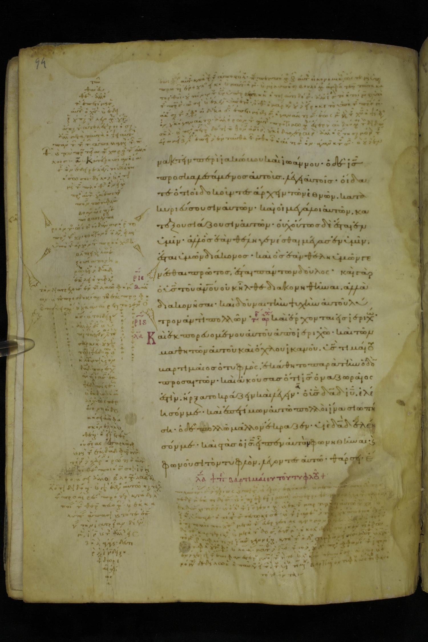 Tenth century minuscule of the Gospels with commentary on parchment; 153 leaves, 1 column, 20 lines per page. Images were taken at the National Library of Greece in Athens.