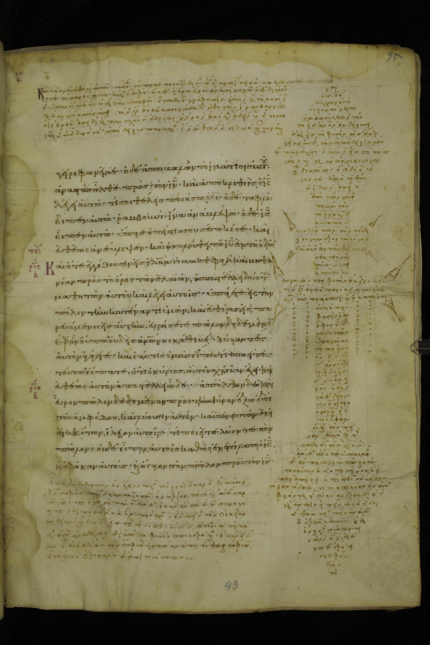 Tenth century minuscule of the Gospels with commentary on parchment; 153 leaves, 1 column, 20 lines per page. Images were taken at the National Library of Greece in Athens.