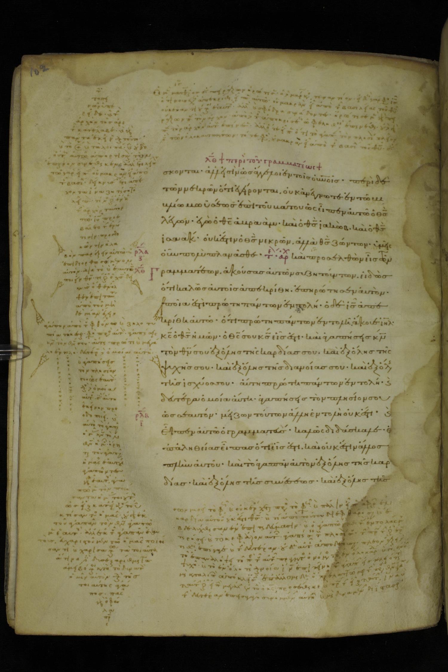 Tenth century minuscule of the Gospels with commentary on parchment; 153 leaves, 1 column, 20 lines per page. Images were taken at the National Library of Greece in Athens.