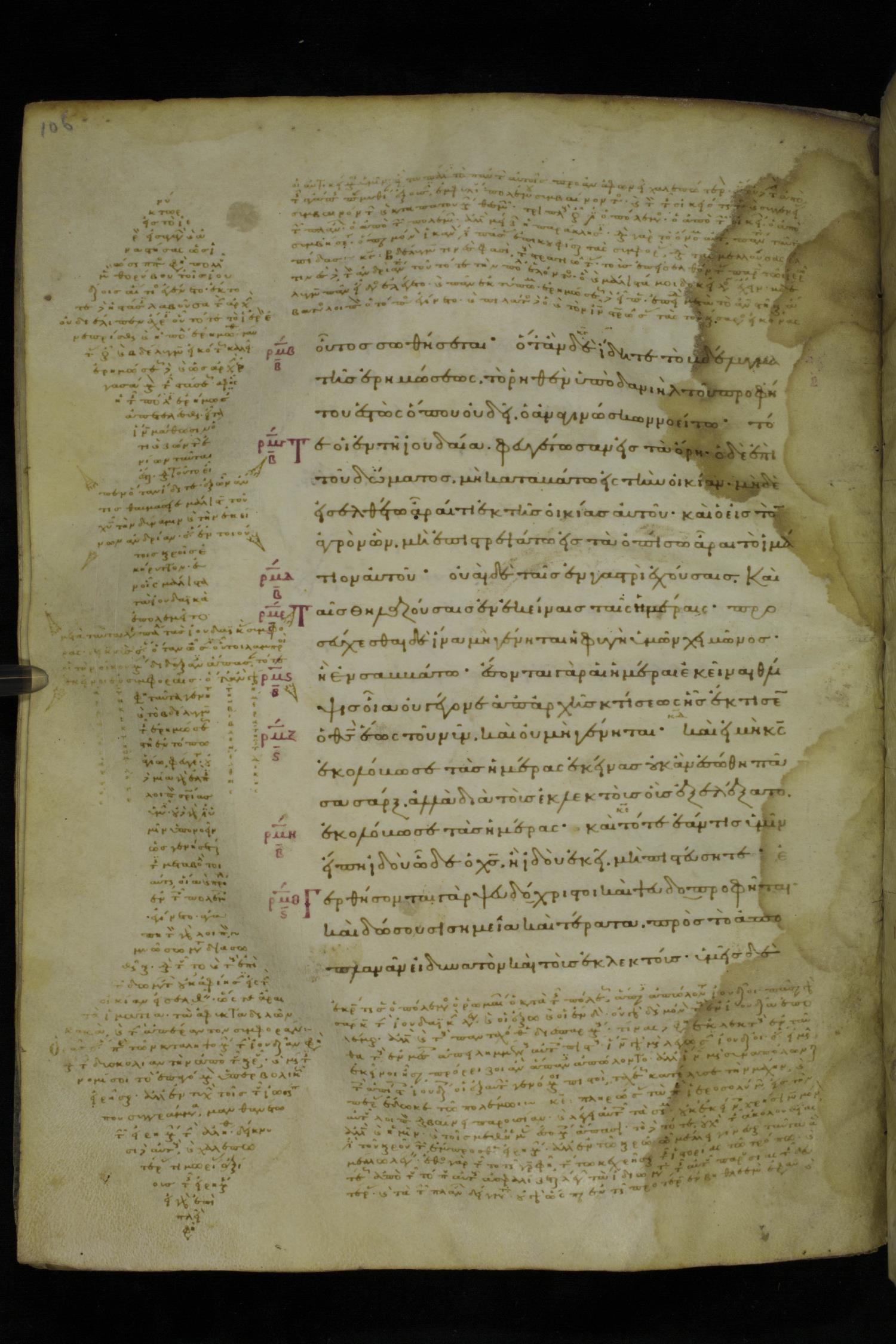 Tenth century minuscule of the Gospels with commentary on parchment; 153 leaves, 1 column, 20 lines per page. Images were taken at the National Library of Greece in Athens.