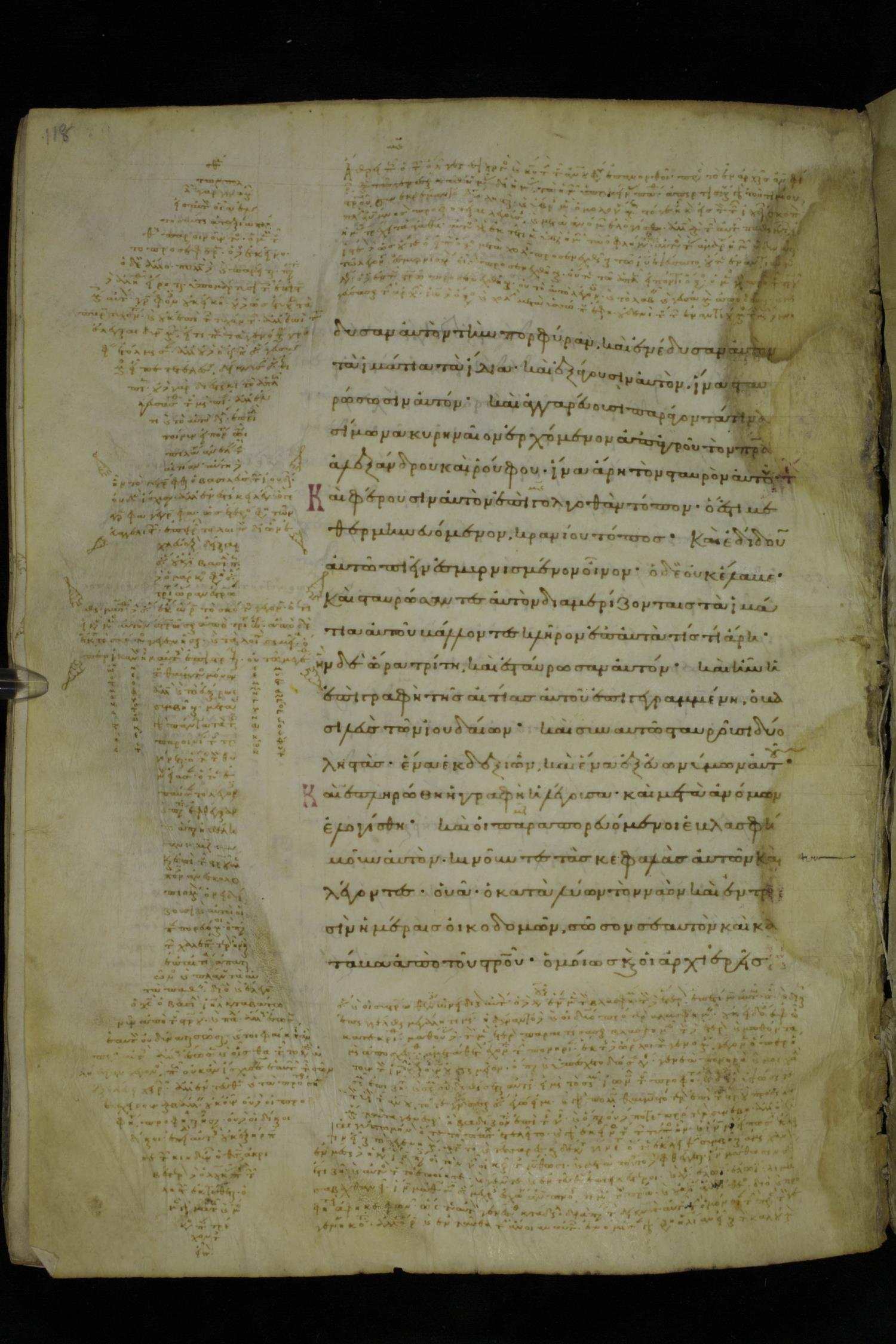 Tenth century minuscule of the Gospels with commentary on parchment; 153 leaves, 1 column, 20 lines per page. Images were taken at the National Library of Greece in Athens.