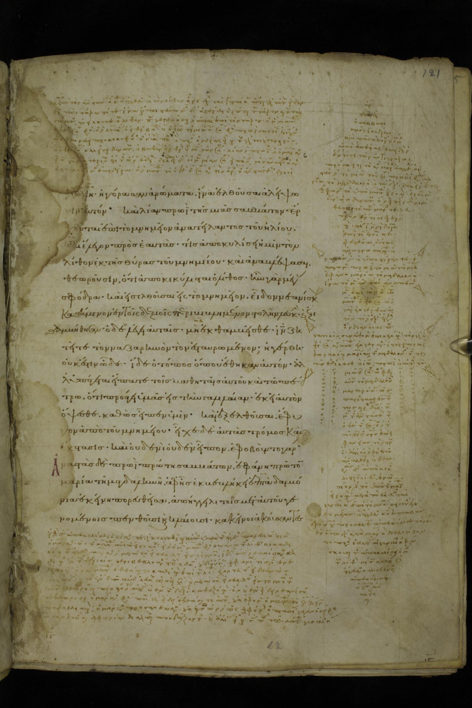 Tenth century minuscule of the Gospels with commentary on parchment; 153 leaves, 1 column, 20 lines per page. Images were taken at the National Library of Greece in Athens.