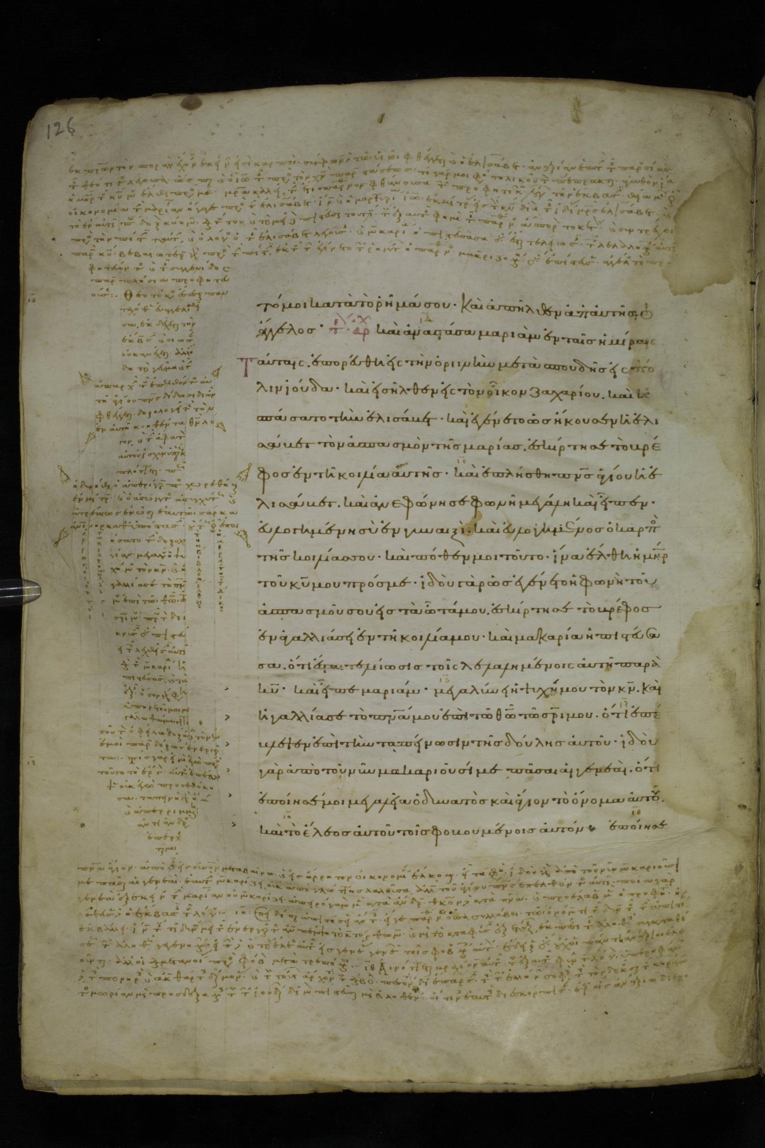 Tenth century minuscule of the Gospels with commentary on parchment; 153 leaves, 1 column, 20 lines per page. Images were taken at the National Library of Greece in Athens.