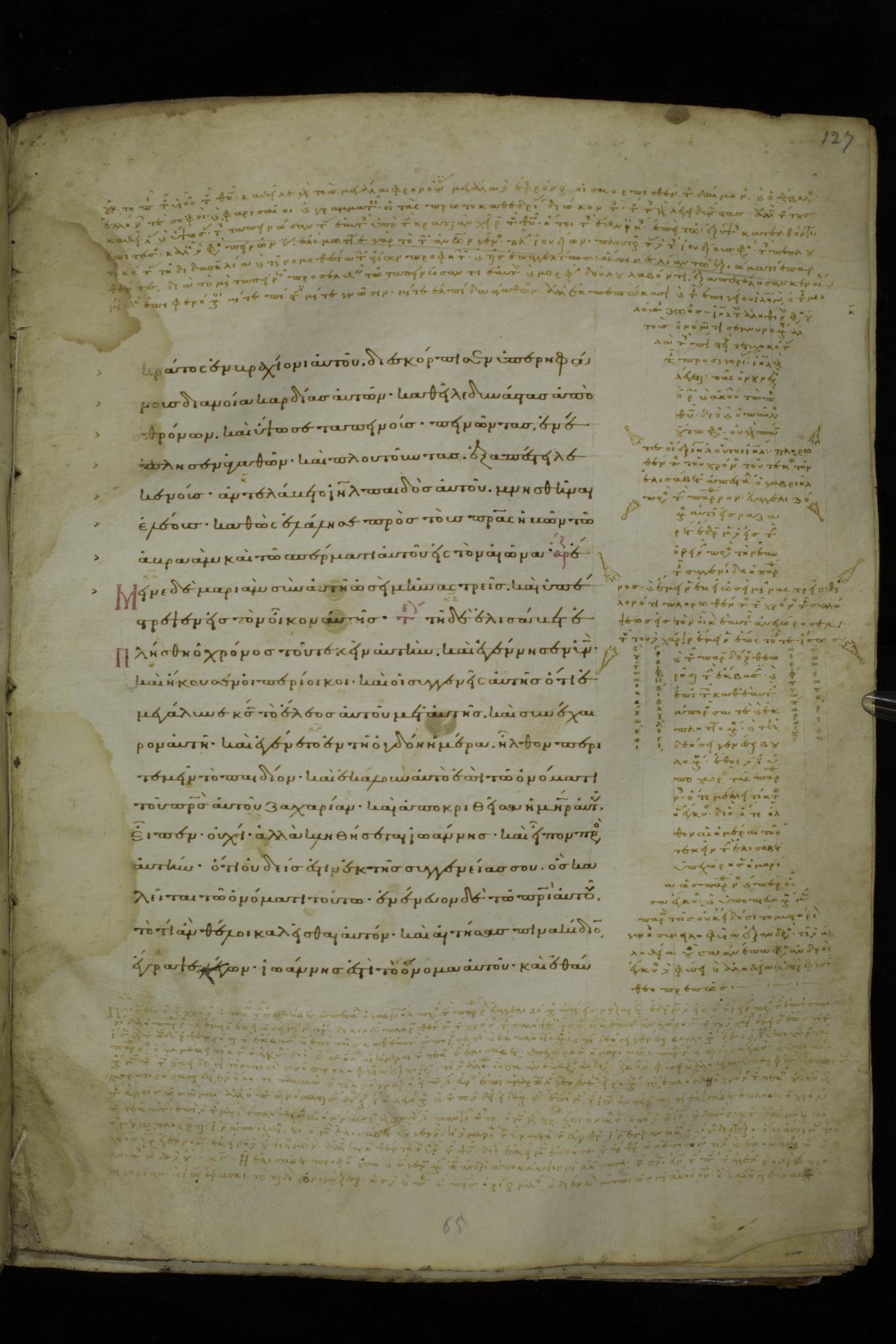 Tenth century minuscule of the Gospels with commentary on parchment; 153 leaves, 1 column, 20 lines per page. Images were taken at the National Library of Greece in Athens.