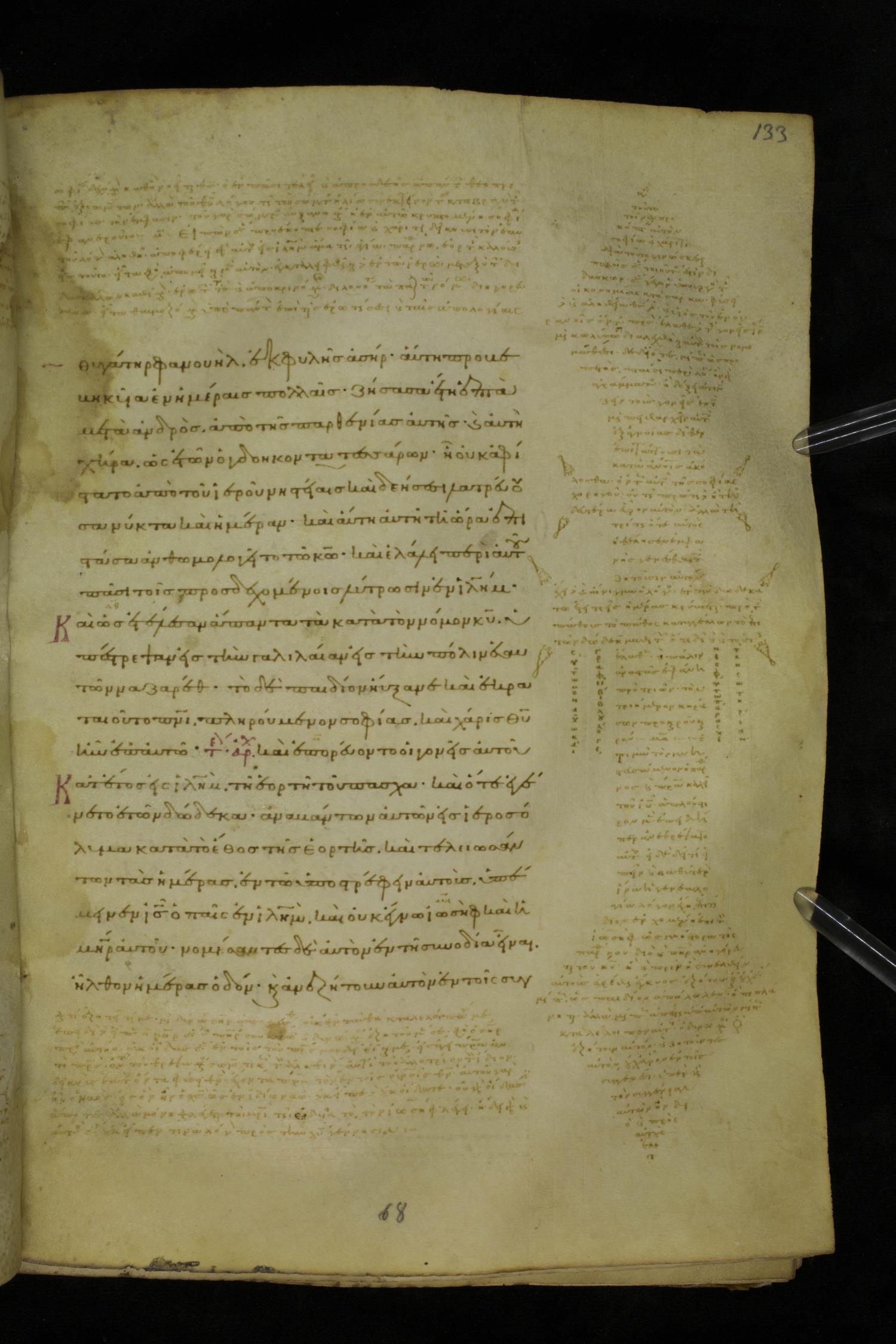 Tenth century minuscule of the Gospels with commentary on parchment; 153 leaves, 1 column, 20 lines per page. Images were taken at the National Library of Greece in Athens.