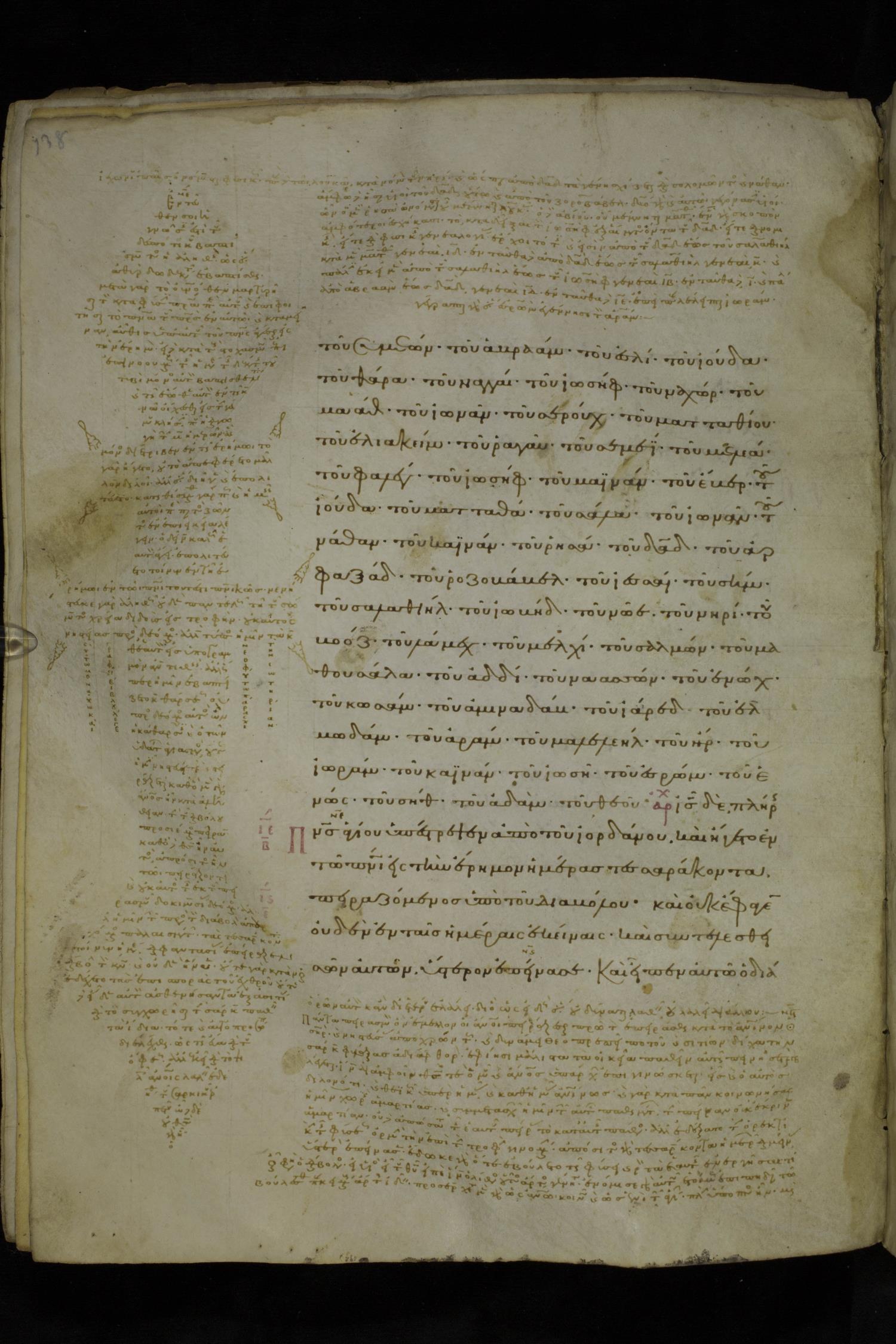 Tenth century minuscule of the Gospels with commentary on parchment; 153 leaves, 1 column, 20 lines per page. Images were taken at the National Library of Greece in Athens.