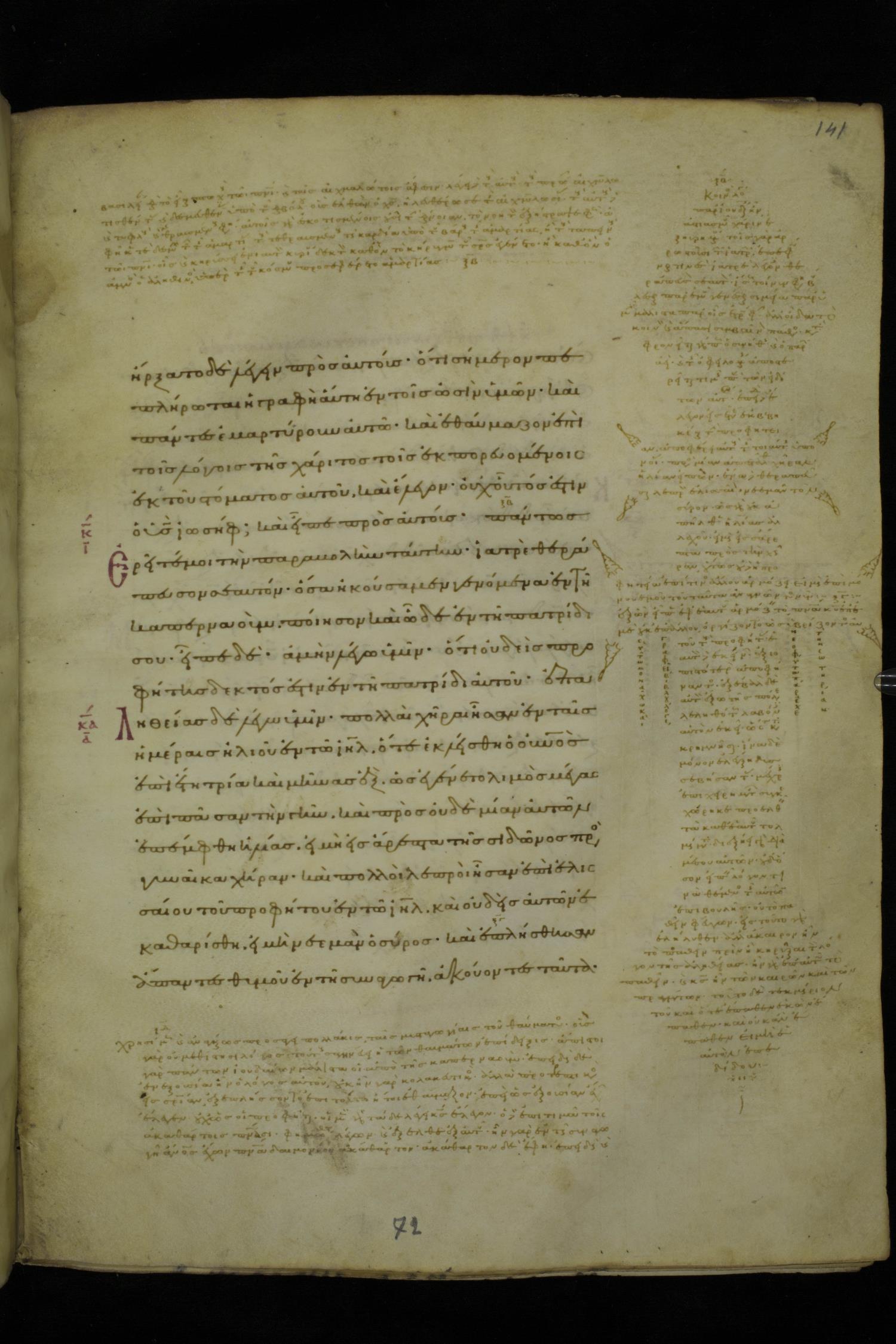 Tenth century minuscule of the Gospels with commentary on parchment; 153 leaves, 1 column, 20 lines per page. Images were taken at the National Library of Greece in Athens.