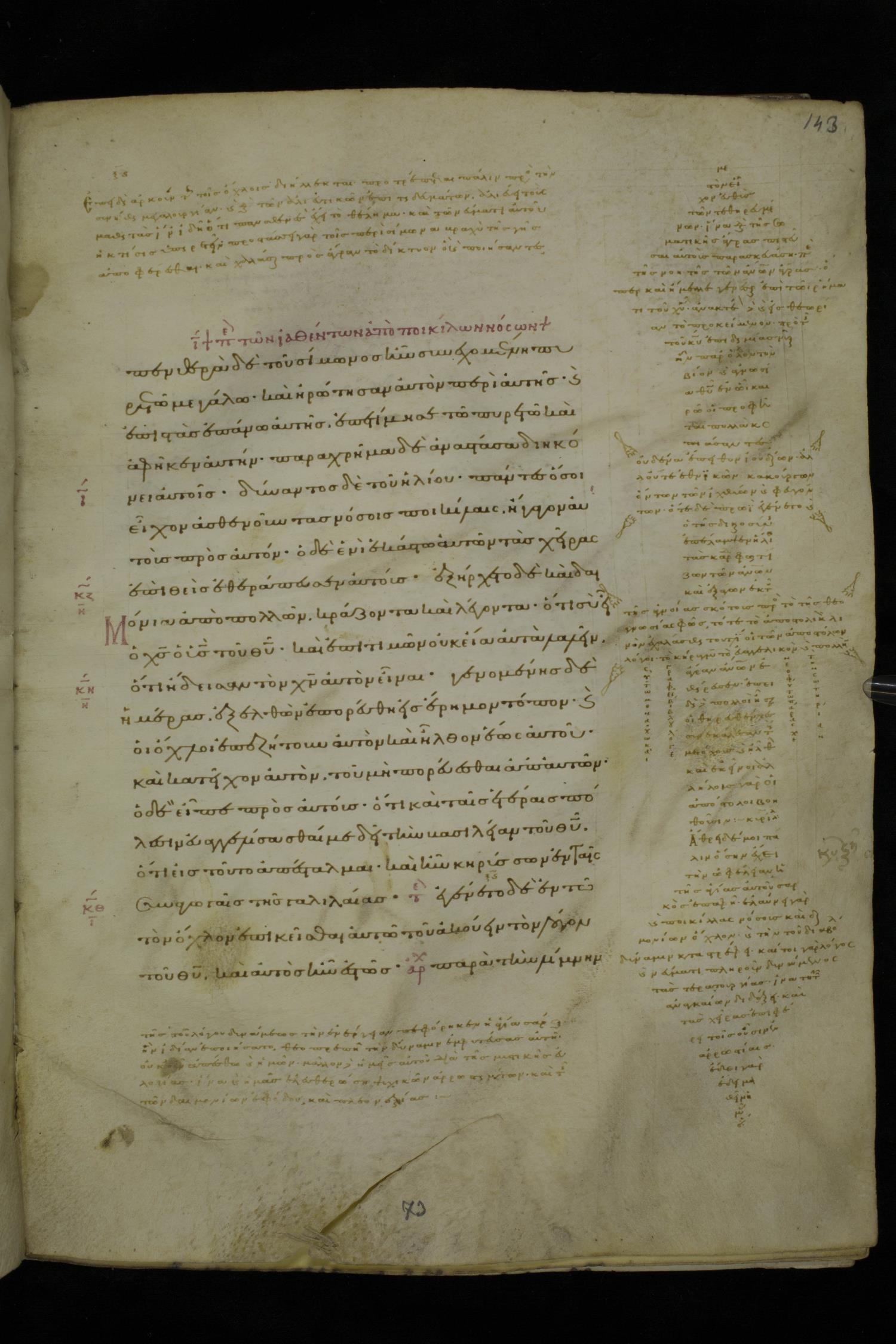 Tenth century minuscule of the Gospels with commentary on parchment; 153 leaves, 1 column, 20 lines per page. Images were taken at the National Library of Greece in Athens.