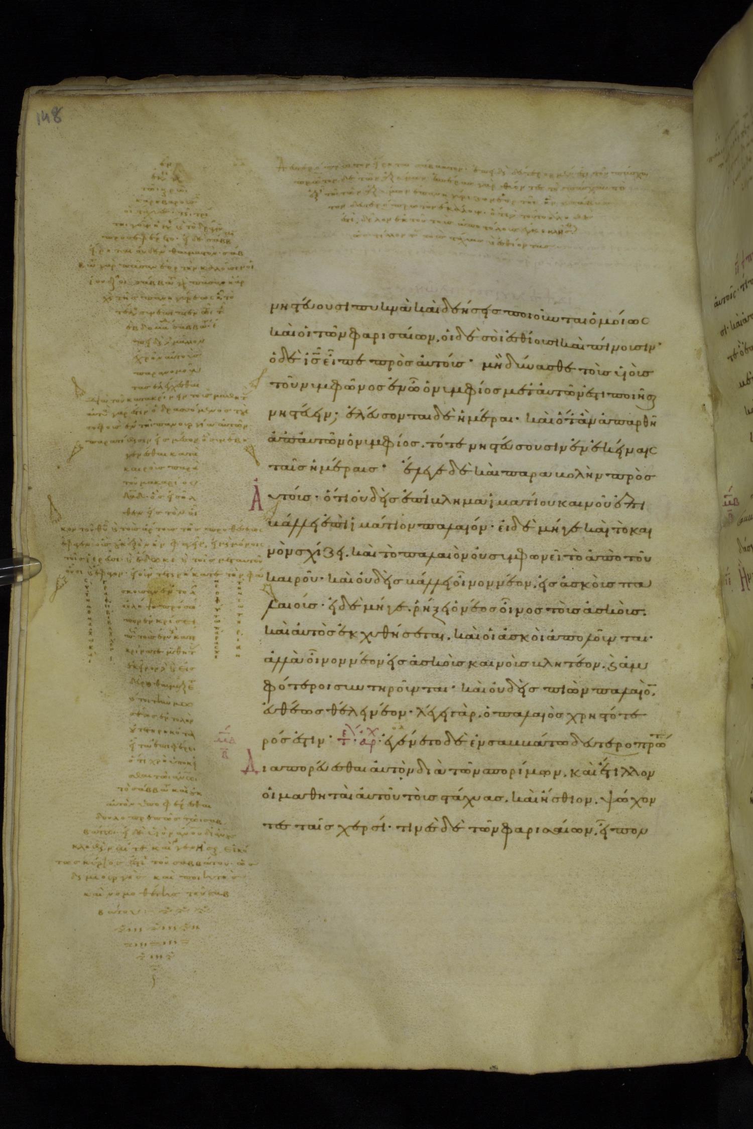 Tenth century minuscule of the Gospels with commentary on parchment; 153 leaves, 1 column, 20 lines per page. Images were taken at the National Library of Greece in Athens.