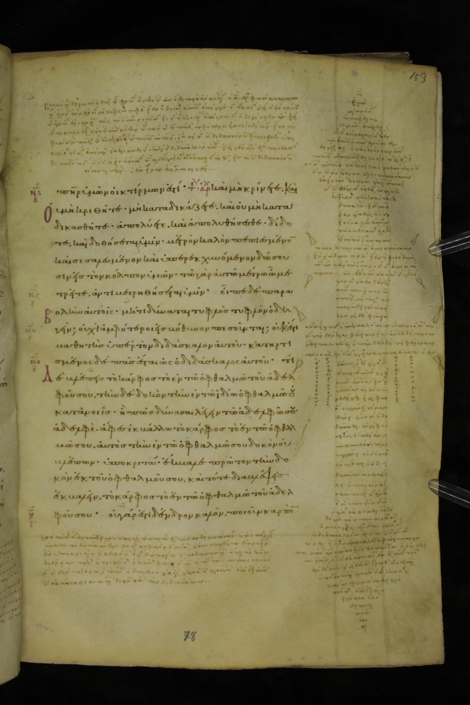 Tenth century minuscule of the Gospels with commentary on parchment; 153 leaves, 1 column, 20 lines per page. Images were taken at the National Library of Greece in Athens.