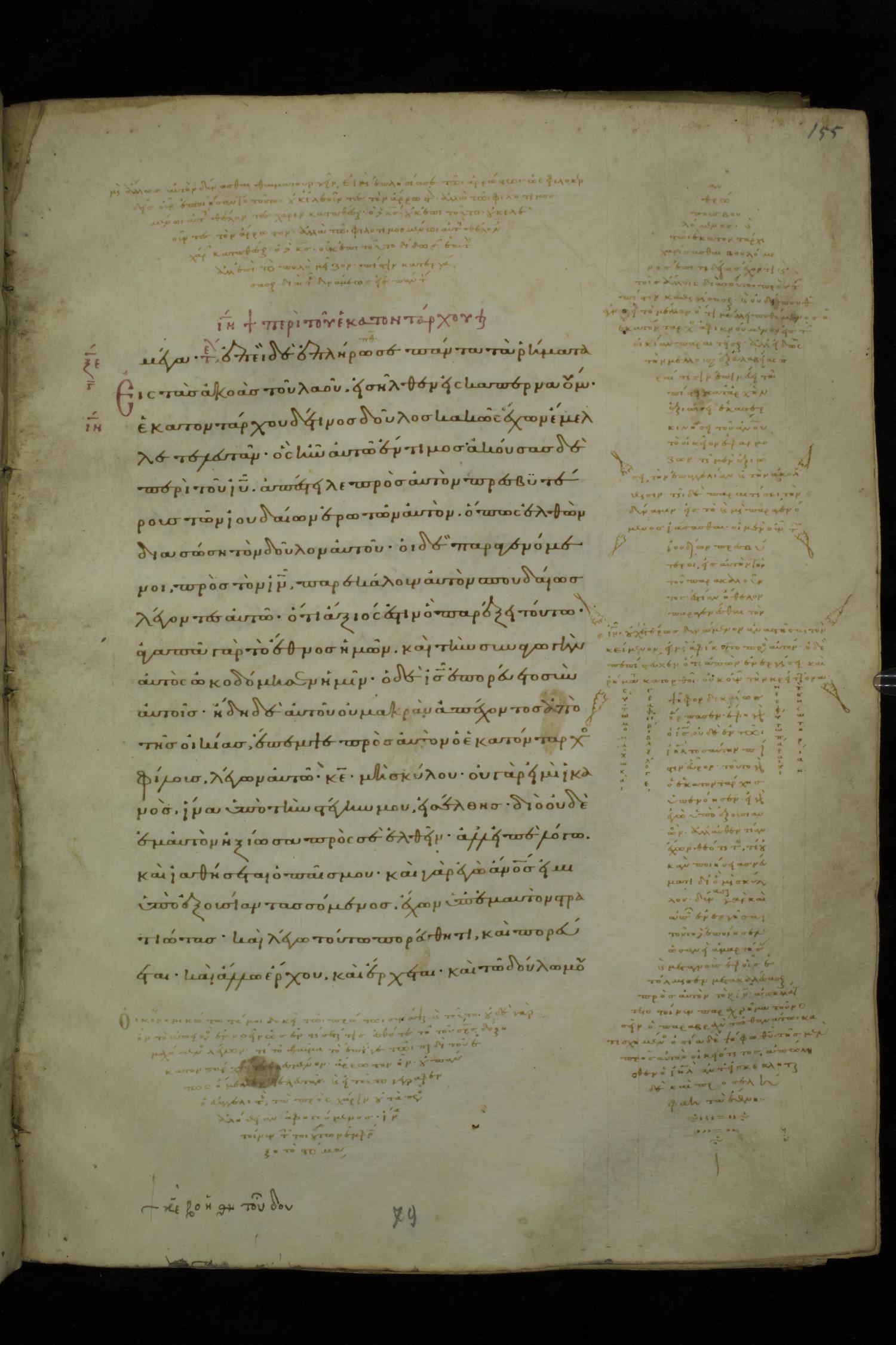 Tenth century minuscule of the Gospels with commentary on parchment; 153 leaves, 1 column, 20 lines per page. Images were taken at the National Library of Greece in Athens.