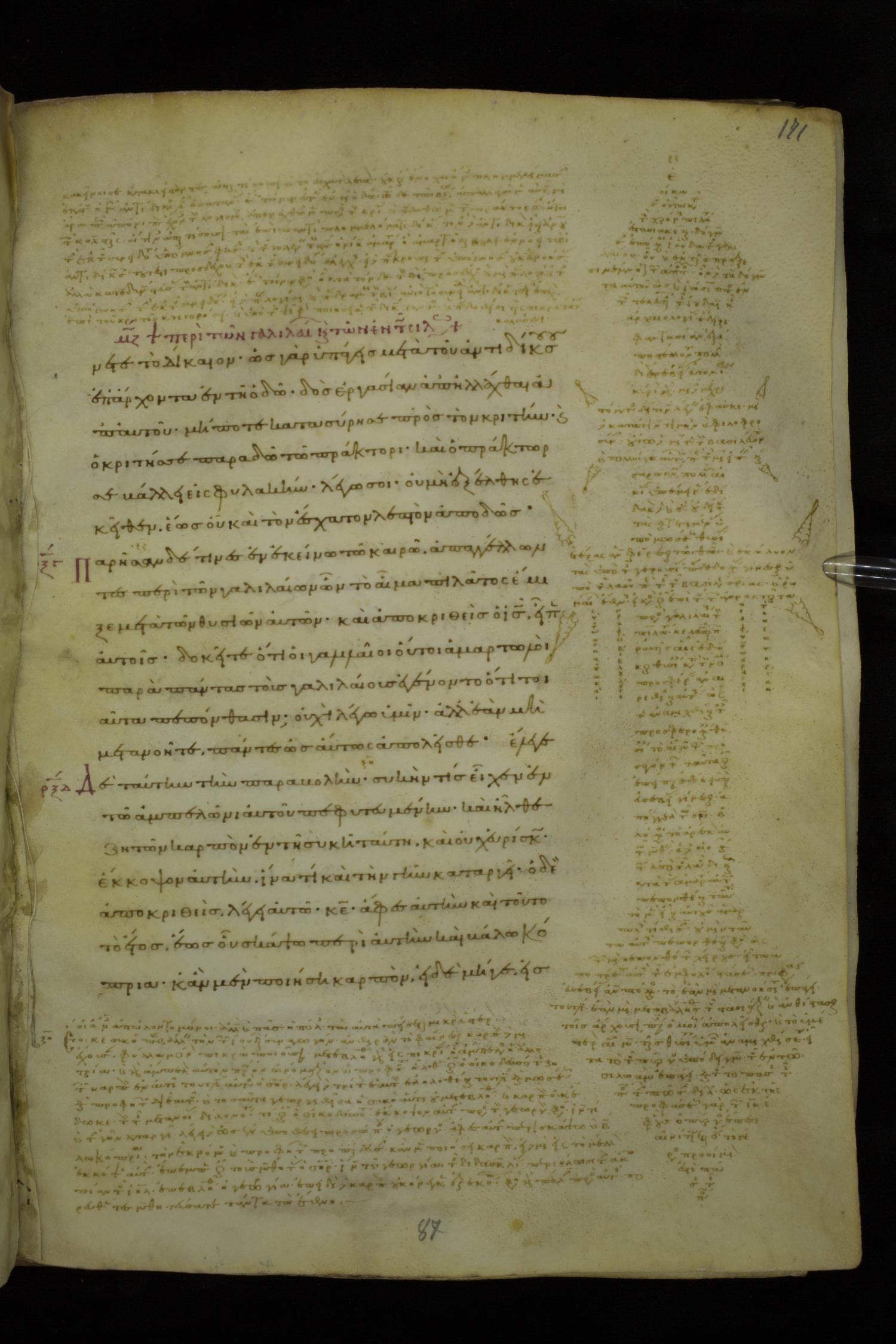 Tenth century minuscule of the Gospels with commentary on parchment; 153 leaves, 1 column, 20 lines per page. Images were taken at the National Library of Greece in Athens.