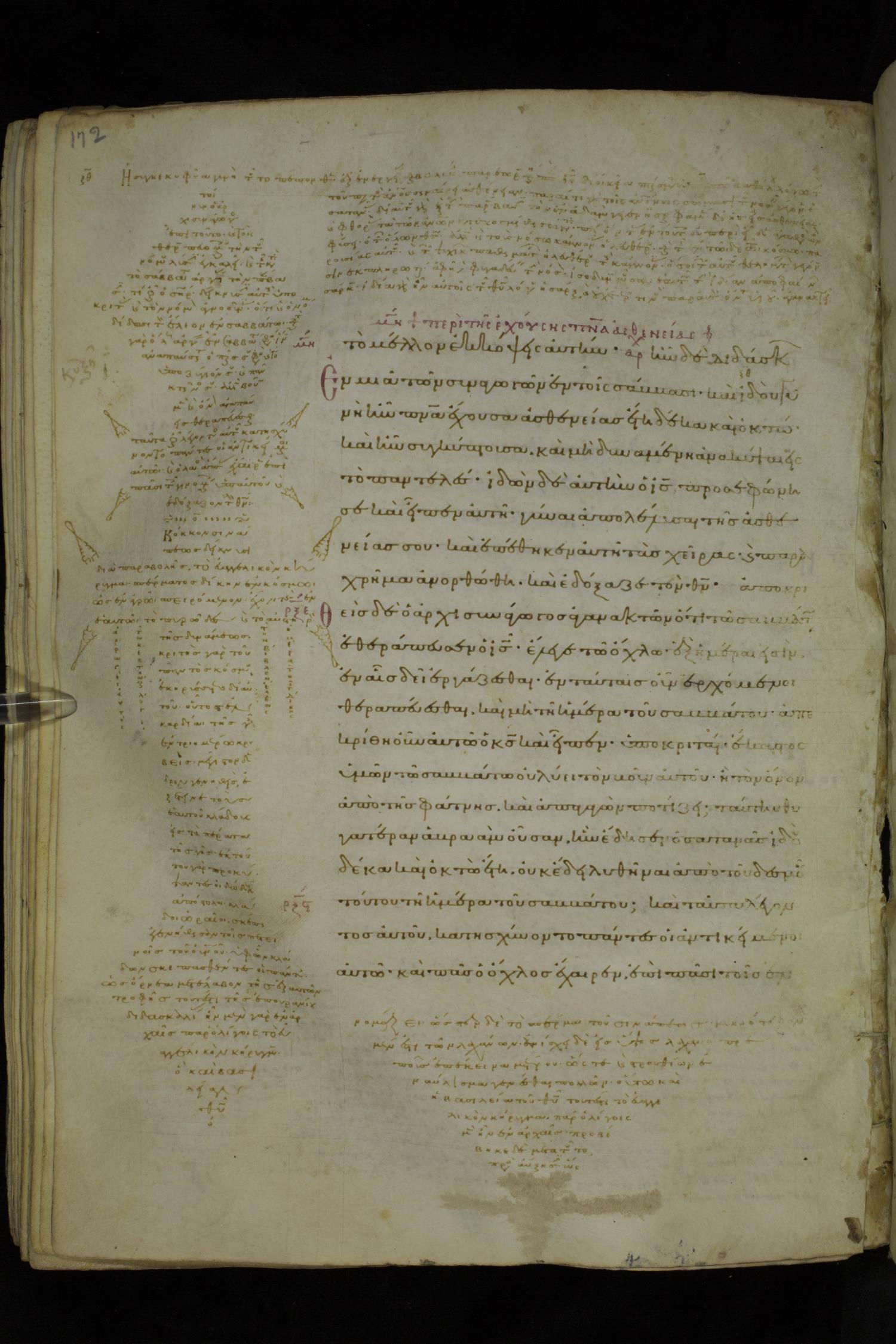 Tenth century minuscule of the Gospels with commentary on parchment; 153 leaves, 1 column, 20 lines per page. Images were taken at the National Library of Greece in Athens.