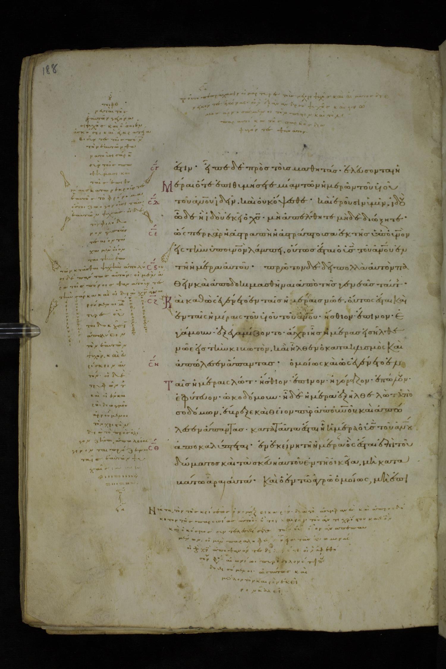 Tenth century minuscule of the Gospels with commentary on parchment; 153 leaves, 1 column, 20 lines per page. Images were taken at the National Library of Greece in Athens.