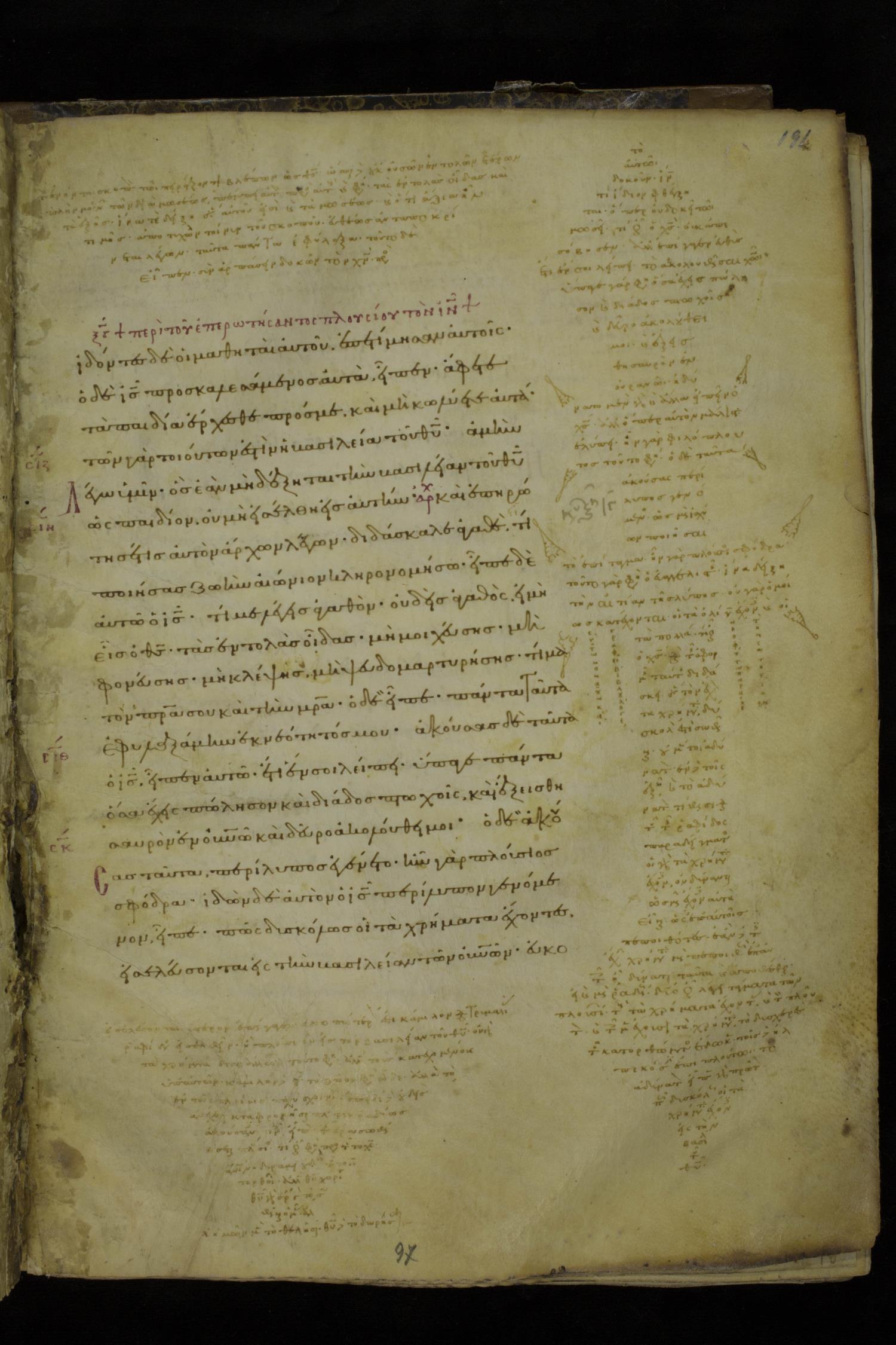 Tenth century minuscule of the Gospels with commentary on parchment; 153 leaves, 1 column, 20 lines per page. Images were taken at the National Library of Greece in Athens.