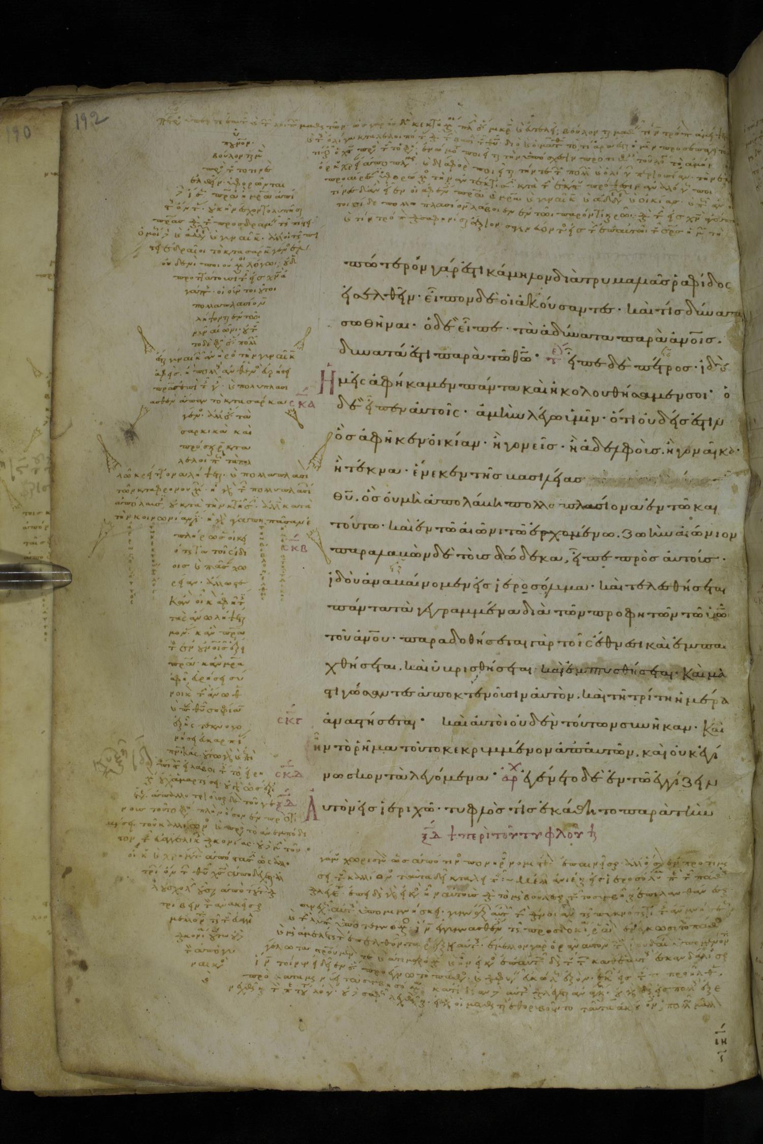 Tenth century minuscule of the Gospels with commentary on parchment; 153 leaves, 1 column, 20 lines per page. Images were taken at the National Library of Greece in Athens.