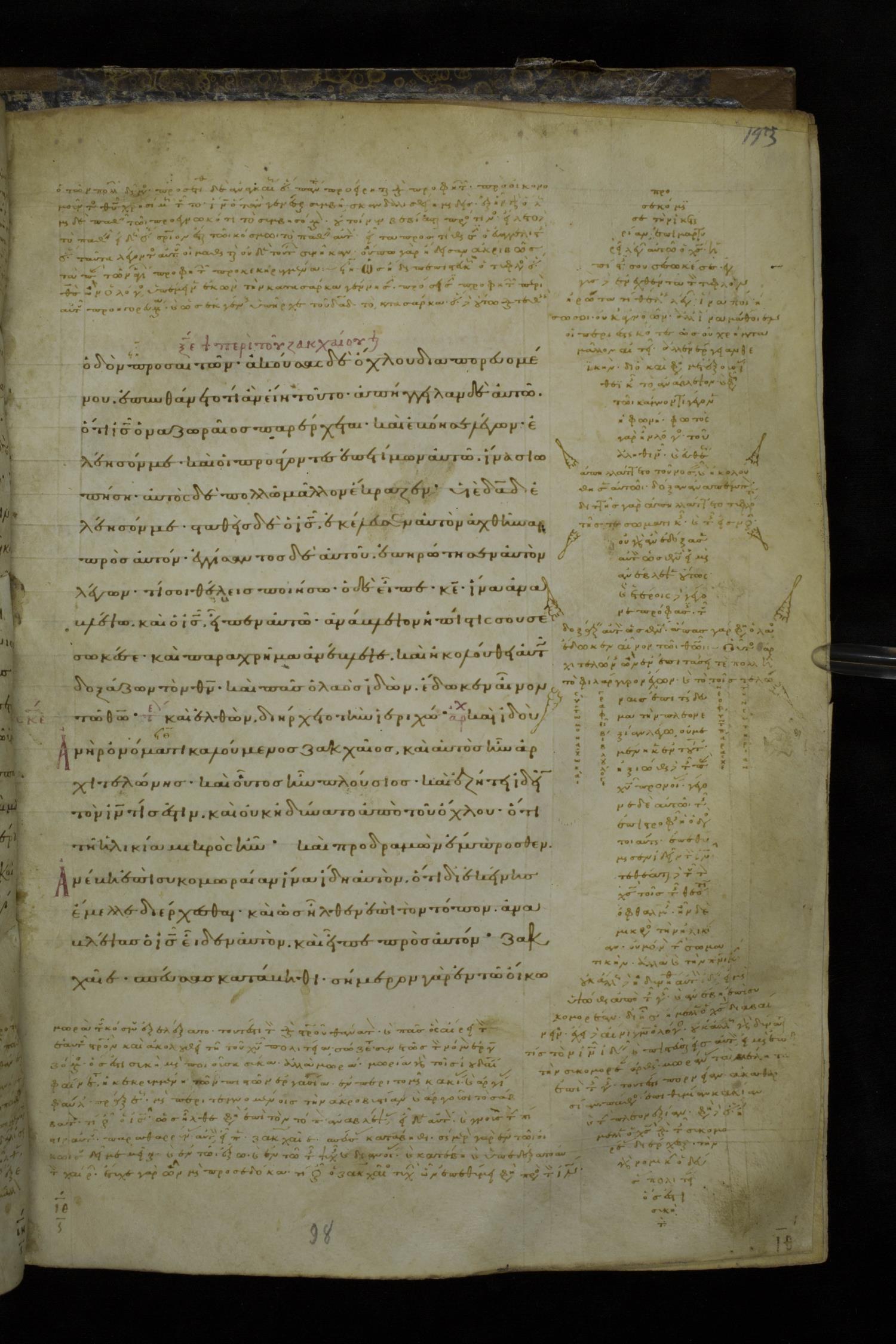 Tenth century minuscule of the Gospels with commentary on parchment; 153 leaves, 1 column, 20 lines per page. Images were taken at the National Library of Greece in Athens.