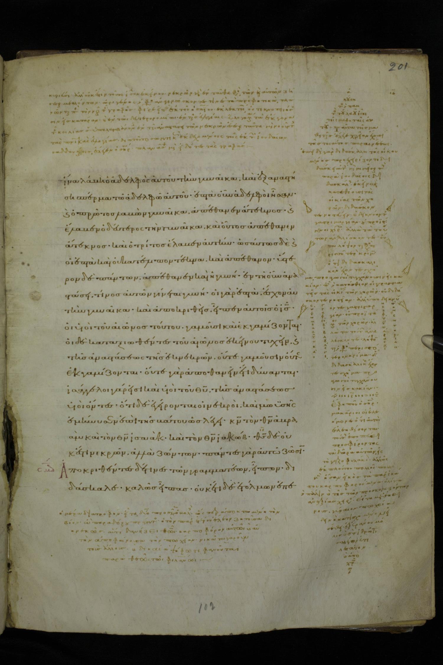 Tenth century minuscule of the Gospels with commentary on parchment; 153 leaves, 1 column, 20 lines per page. Images were taken at the National Library of Greece in Athens.