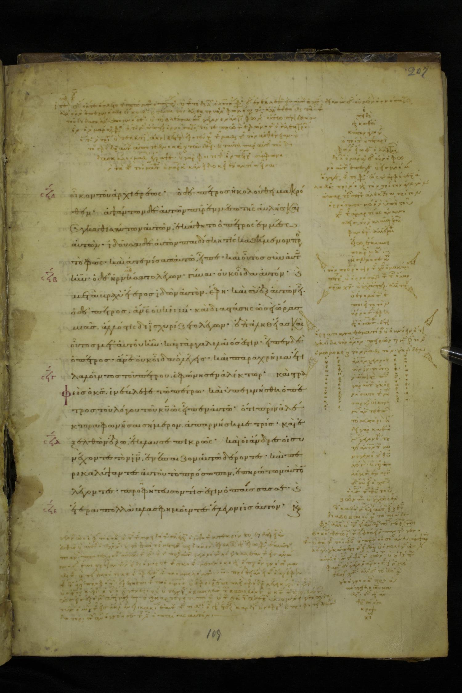 Tenth century minuscule of the Gospels with commentary on parchment; 153 leaves, 1 column, 20 lines per page. Images were taken at the National Library of Greece in Athens.