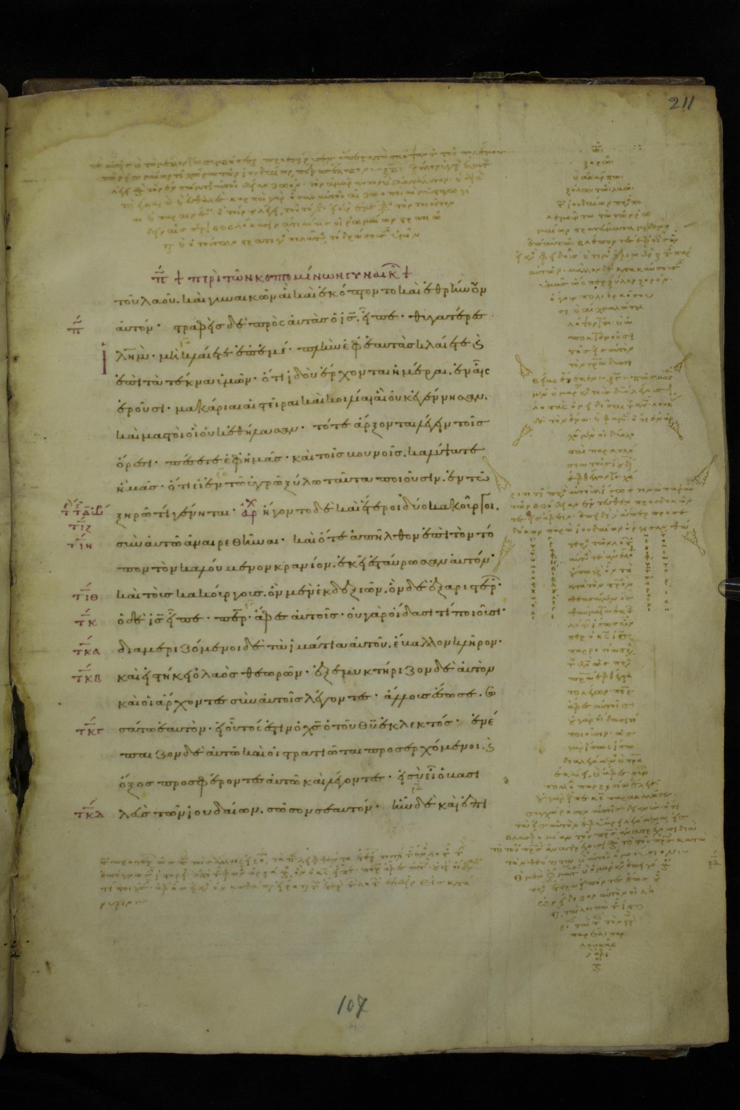 Tenth century minuscule of the Gospels with commentary on parchment; 153 leaves, 1 column, 20 lines per page. Images were taken at the National Library of Greece in Athens.