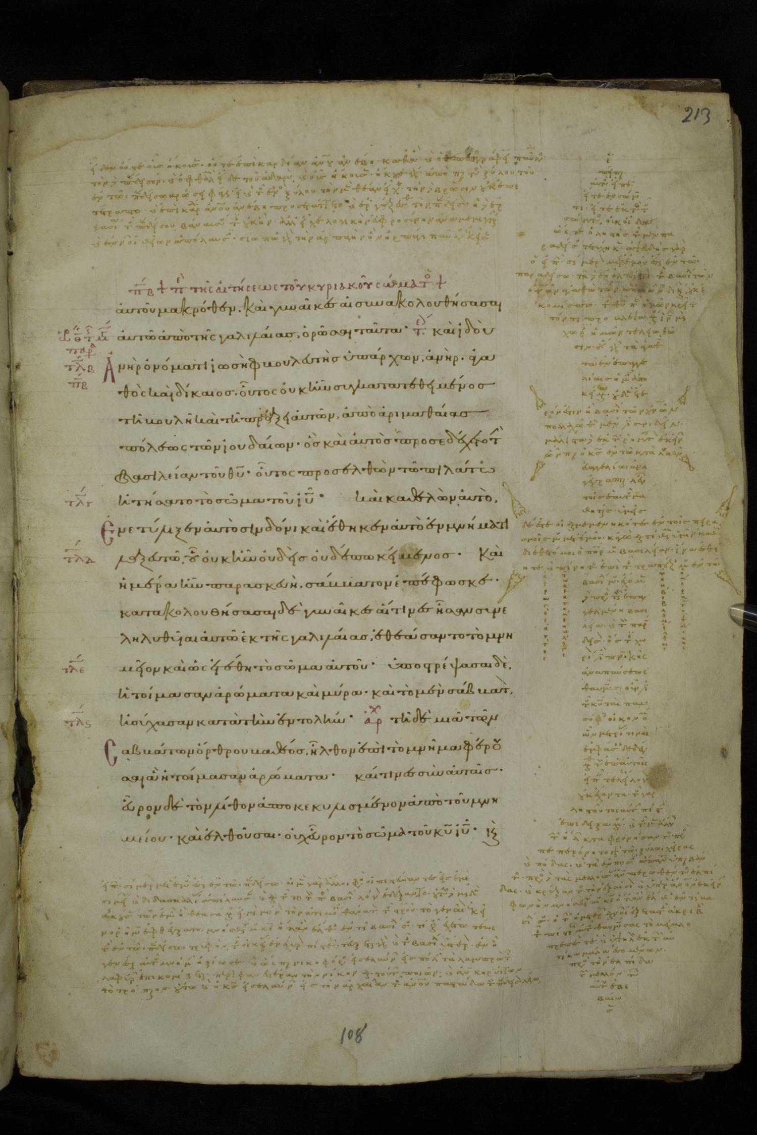 Tenth century minuscule of the Gospels with commentary on parchment; 153 leaves, 1 column, 20 lines per page. Images were taken at the National Library of Greece in Athens.