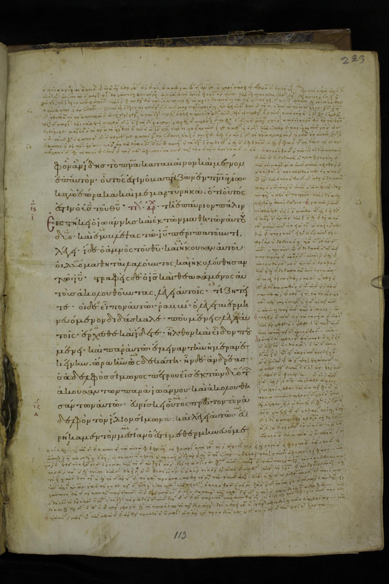 Tenth century minuscule of the Gospels with commentary on parchment; 153 leaves, 1 column, 20 lines per page. Images were taken at the National Library of Greece in Athens.