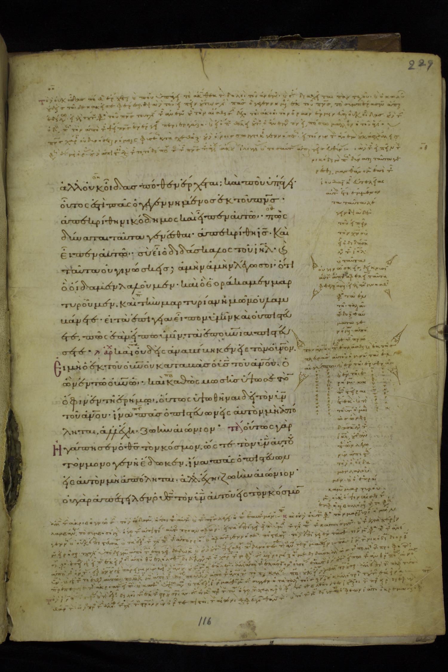 Tenth century minuscule of the Gospels with commentary on parchment; 153 leaves, 1 column, 20 lines per page. Images were taken at the National Library of Greece in Athens.