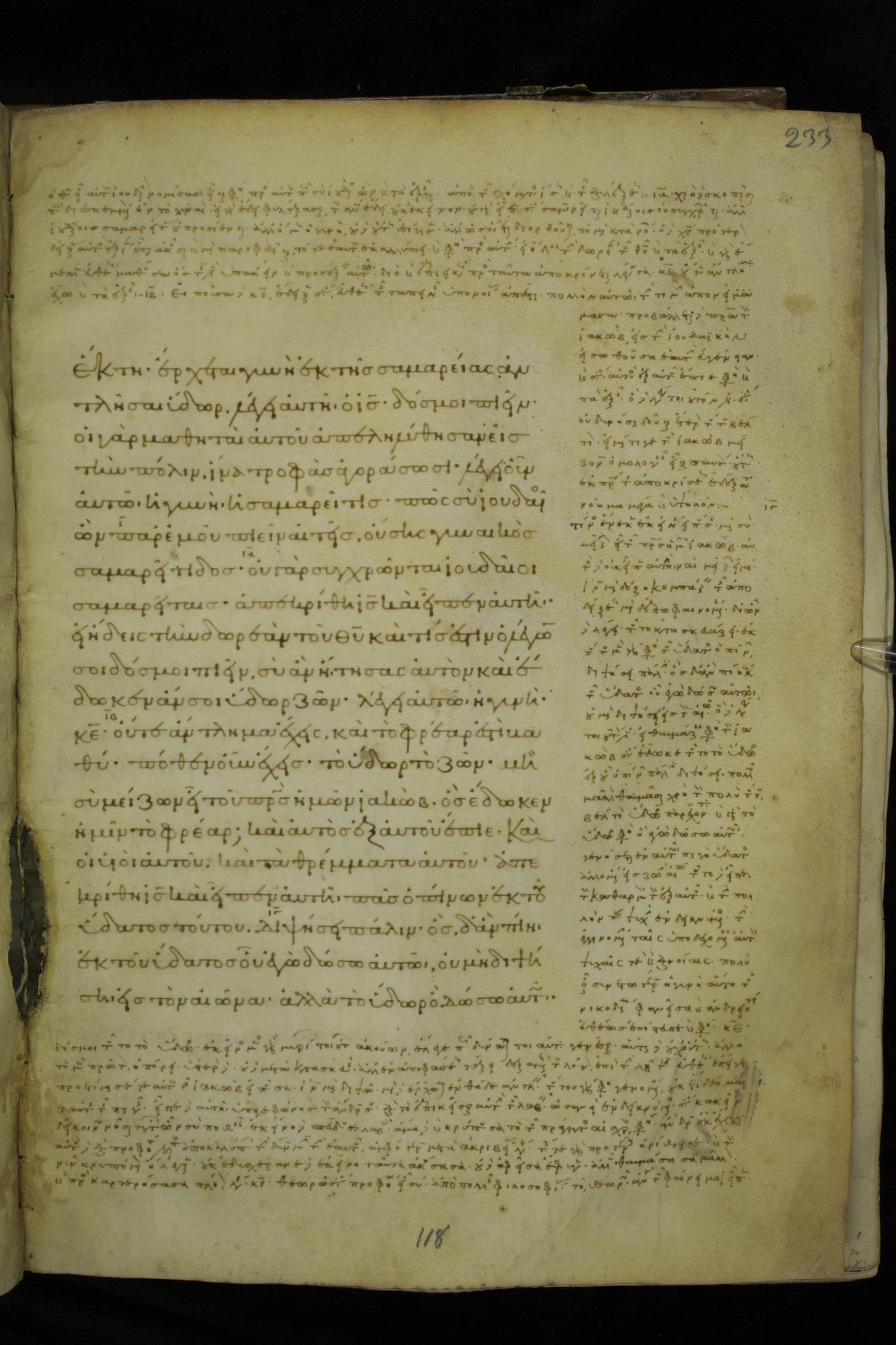 Tenth century minuscule of the Gospels with commentary on parchment; 153 leaves, 1 column, 20 lines per page. Images were taken at the National Library of Greece in Athens.
