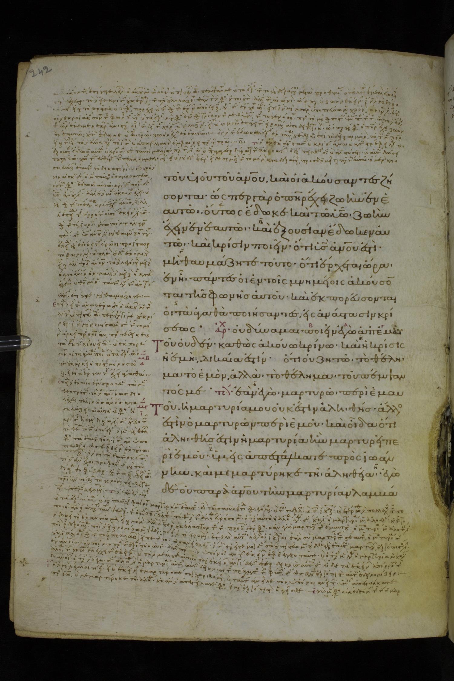 Tenth century minuscule of the Gospels with commentary on parchment; 153 leaves, 1 column, 20 lines per page. Images were taken at the National Library of Greece in Athens.