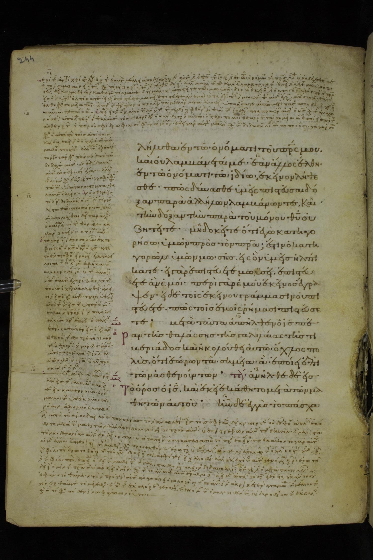 Tenth century minuscule of the Gospels with commentary on parchment; 153 leaves, 1 column, 20 lines per page. Images were taken at the National Library of Greece in Athens.