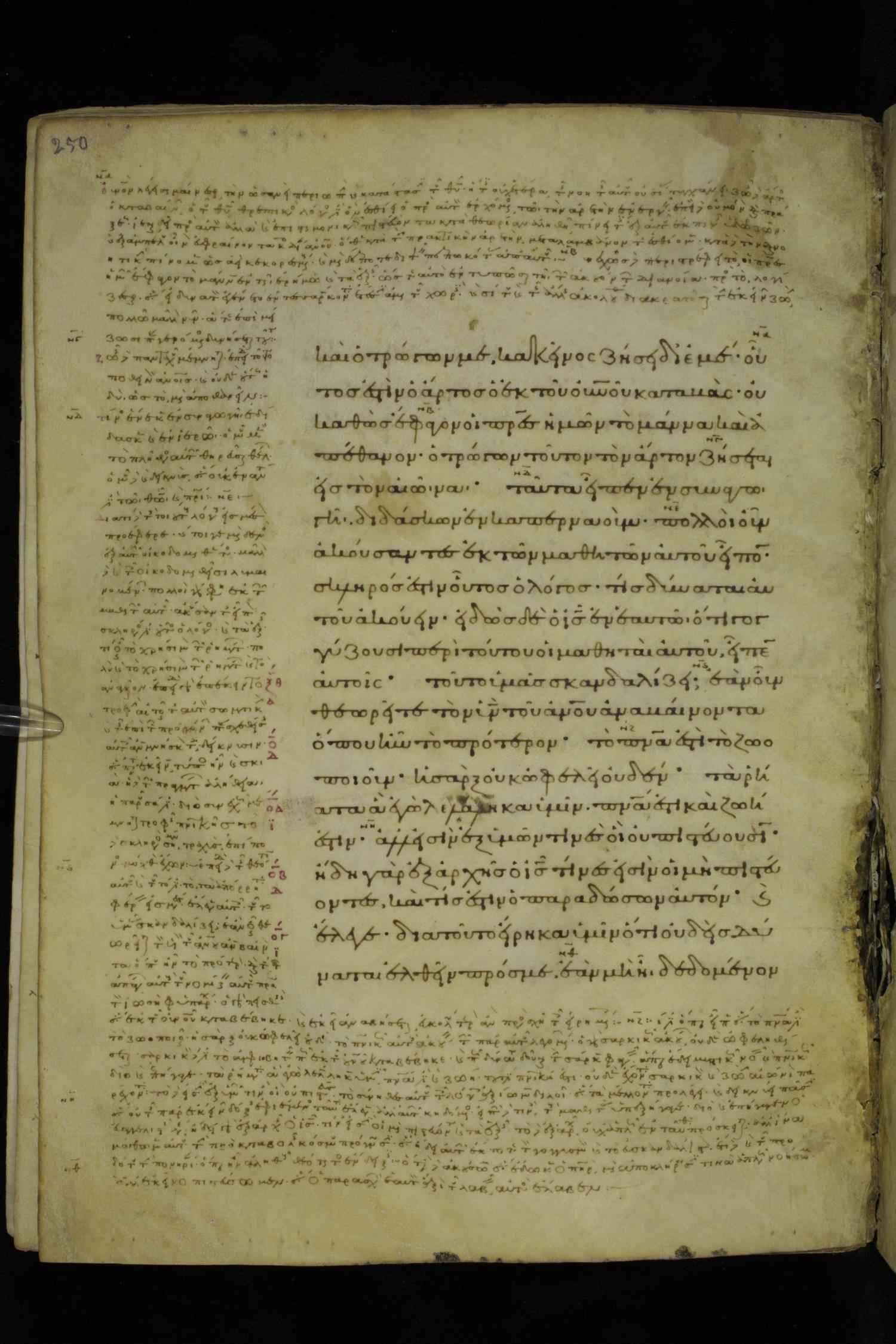 Tenth century minuscule of the Gospels with commentary on parchment; 153 leaves, 1 column, 20 lines per page. Images were taken at the National Library of Greece in Athens.