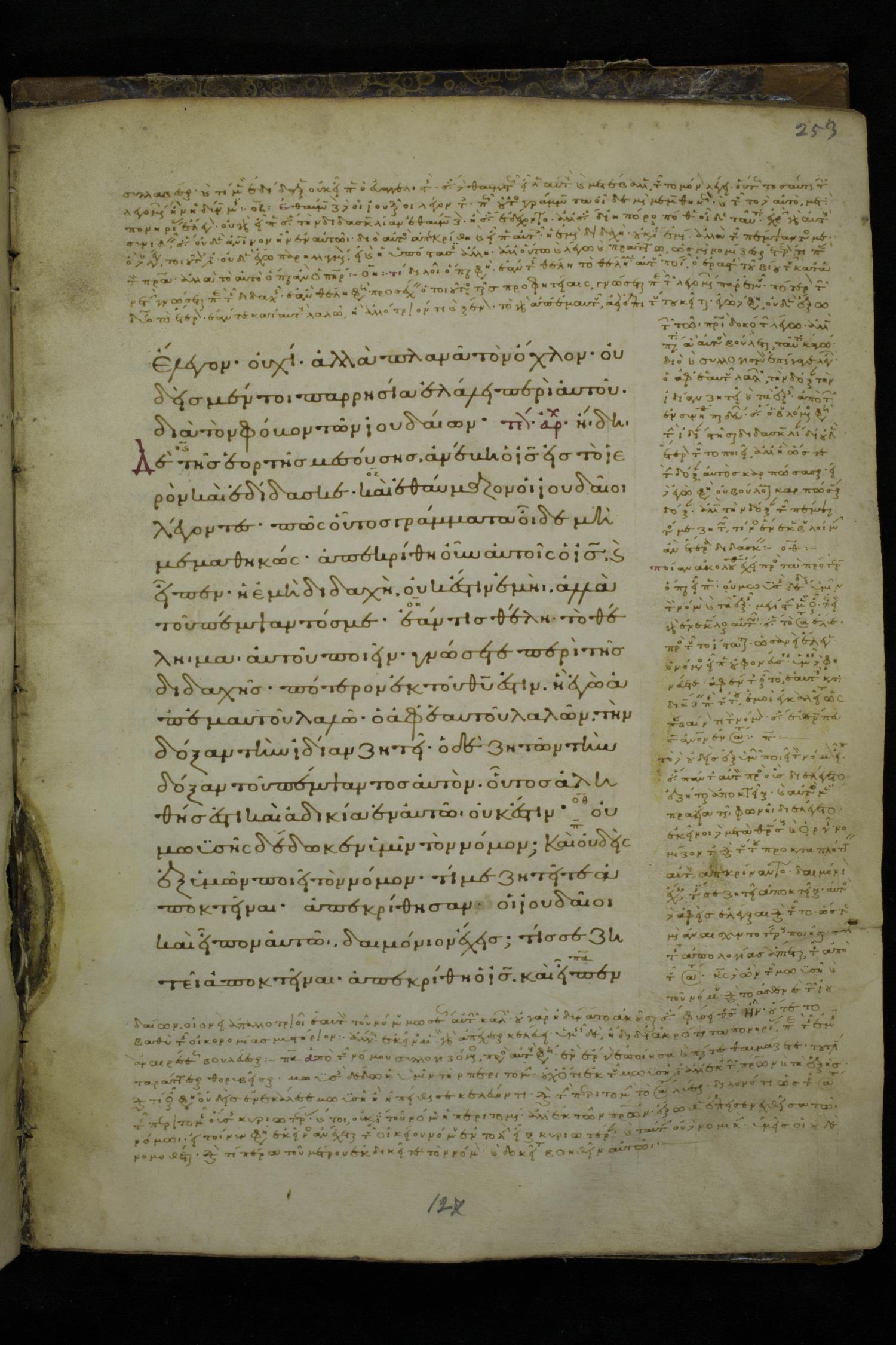 Tenth century minuscule of the Gospels with commentary on parchment; 153 leaves, 1 column, 20 lines per page. Images were taken at the National Library of Greece in Athens.