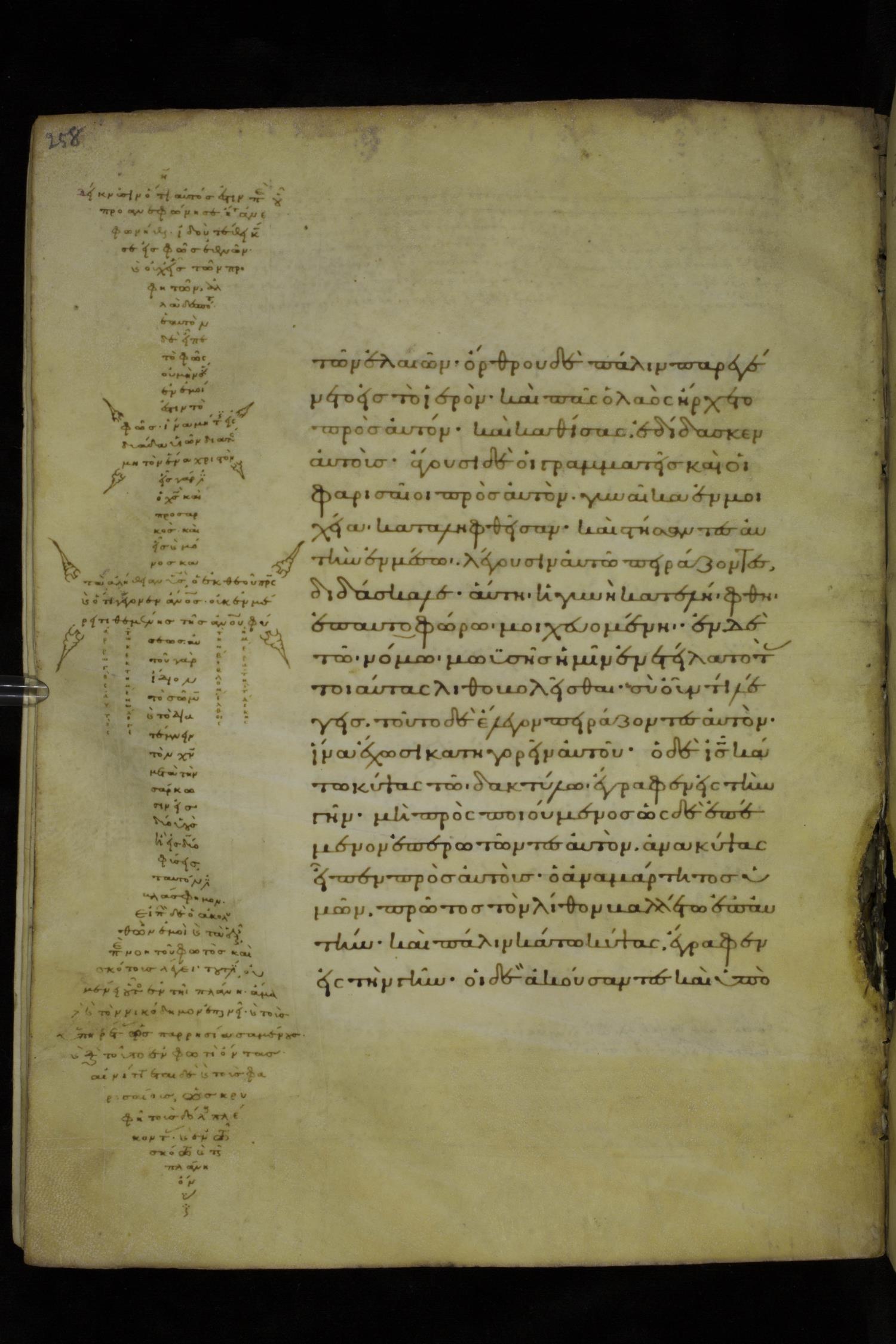Tenth century minuscule of the Gospels with commentary on parchment; 153 leaves, 1 column, 20 lines per page. Images were taken at the National Library of Greece in Athens.