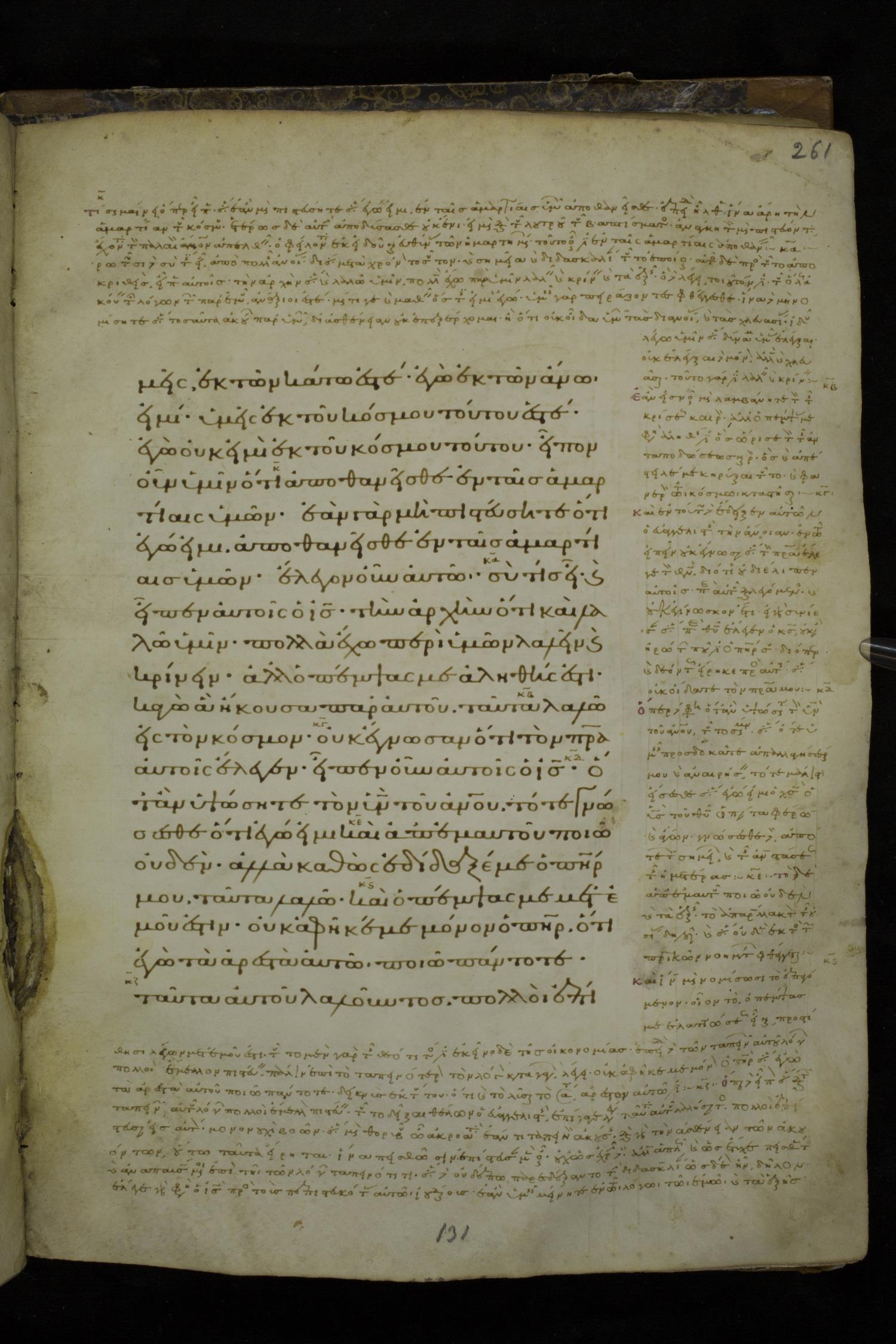 Tenth century minuscule of the Gospels with commentary on parchment; 153 leaves, 1 column, 20 lines per page. Images were taken at the National Library of Greece in Athens.