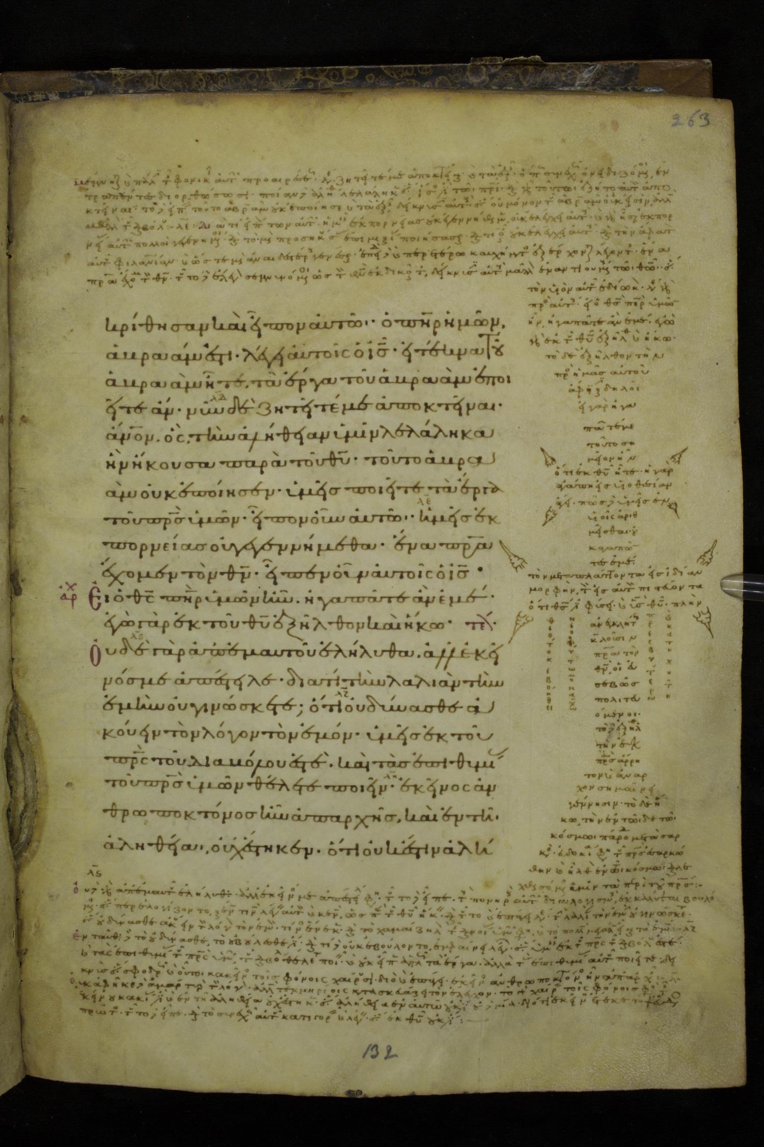 Tenth century minuscule of the Gospels with commentary on parchment; 153 leaves, 1 column, 20 lines per page. Images were taken at the National Library of Greece in Athens.