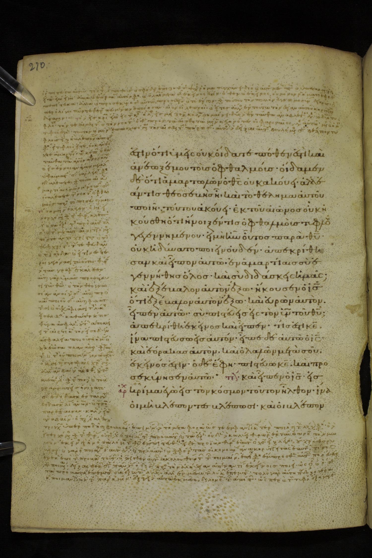 Tenth century minuscule of the Gospels with commentary on parchment; 153 leaves, 1 column, 20 lines per page. Images were taken at the National Library of Greece in Athens.