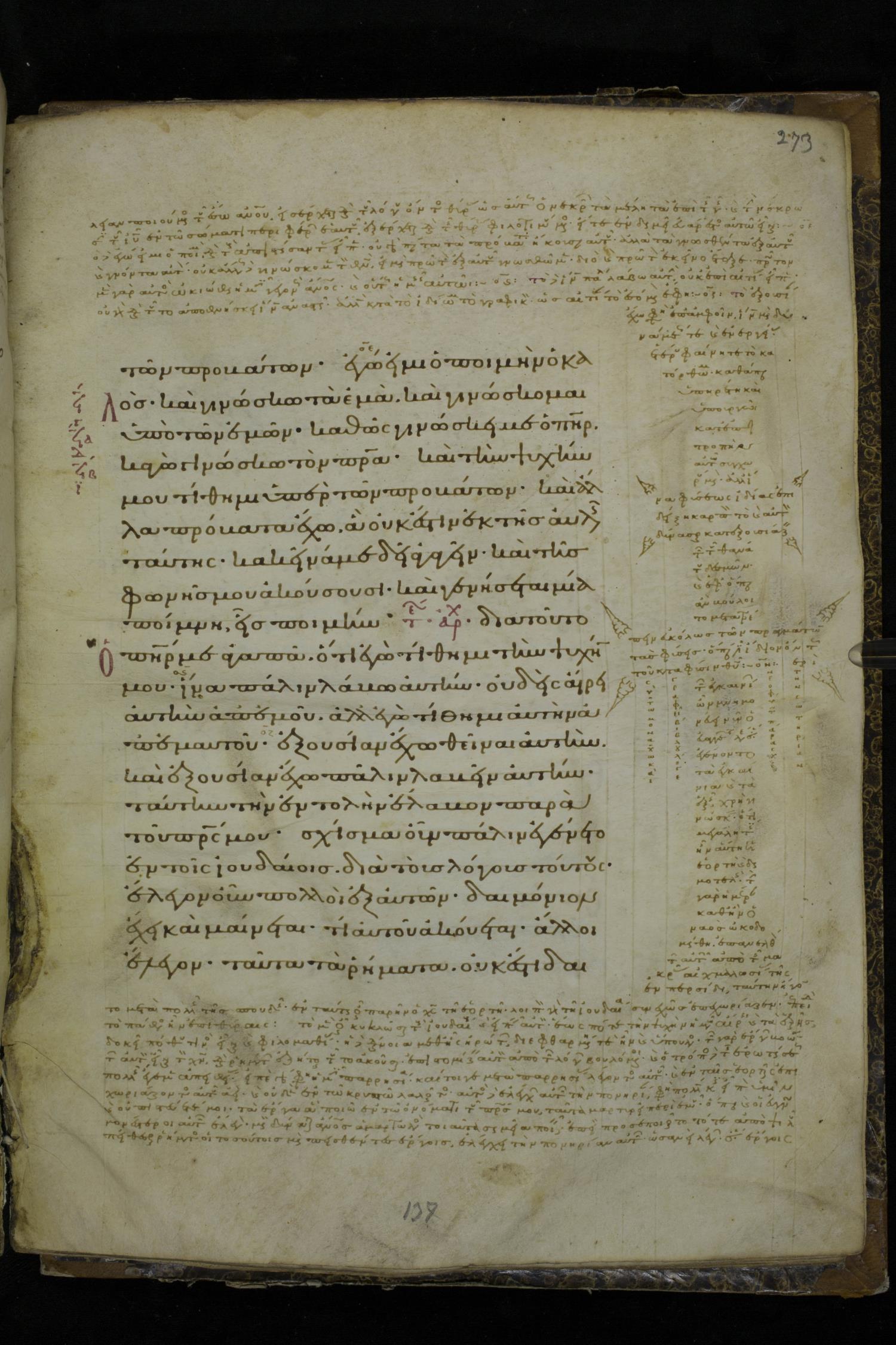 Tenth century minuscule of the Gospels with commentary on parchment; 153 leaves, 1 column, 20 lines per page. Images were taken at the National Library of Greece in Athens.