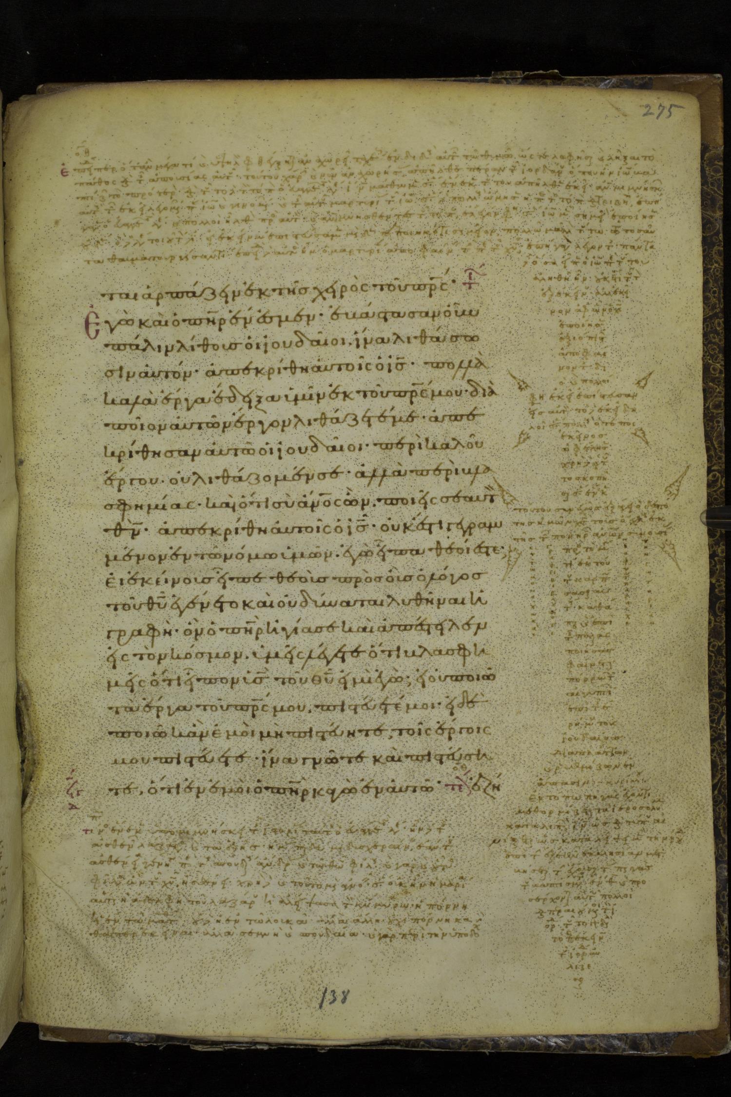Tenth century minuscule of the Gospels with commentary on parchment; 153 leaves, 1 column, 20 lines per page. Images were taken at the National Library of Greece in Athens.
