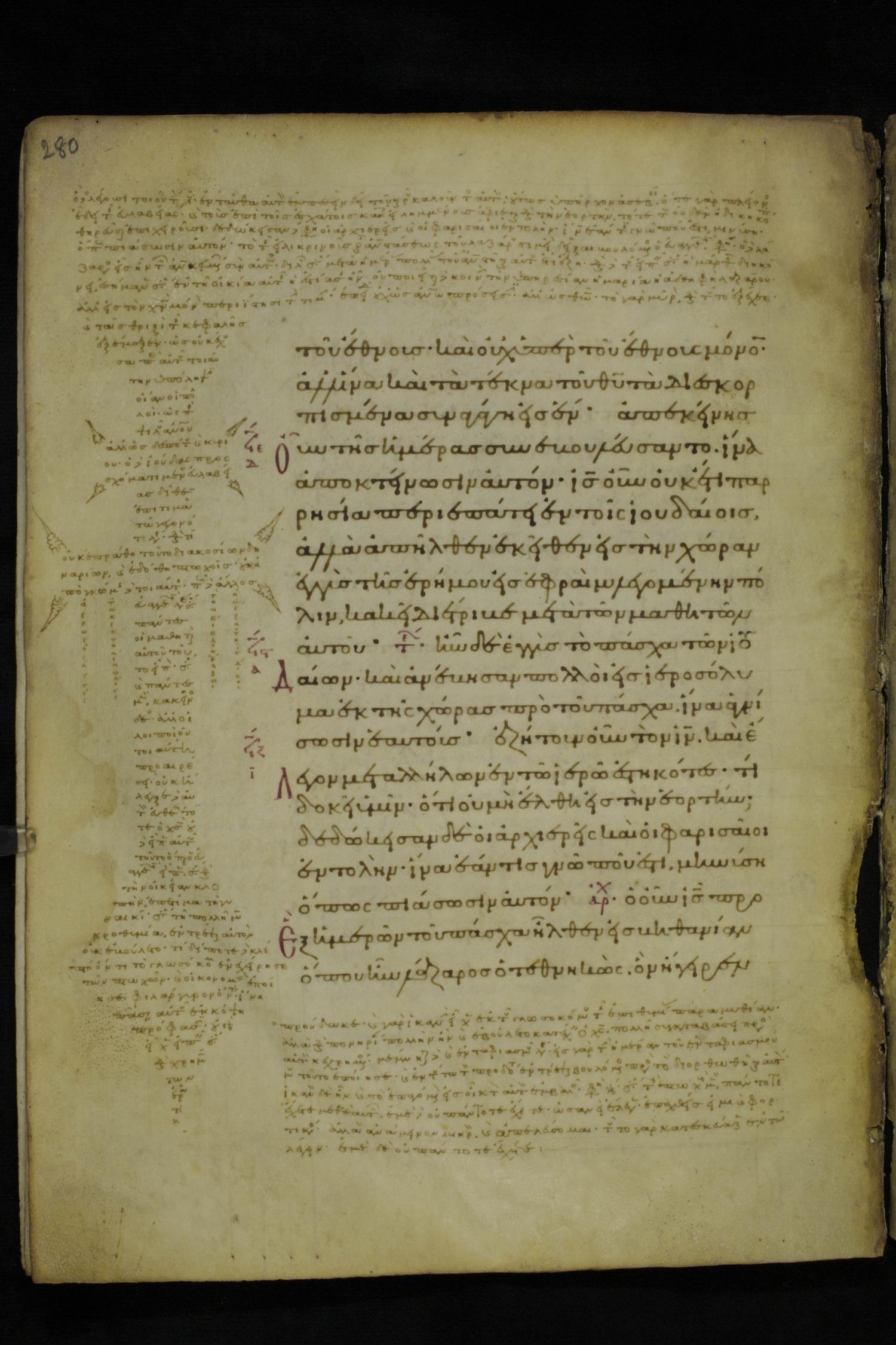 Tenth century minuscule of the Gospels with commentary on parchment; 153 leaves, 1 column, 20 lines per page. Images were taken at the National Library of Greece in Athens.