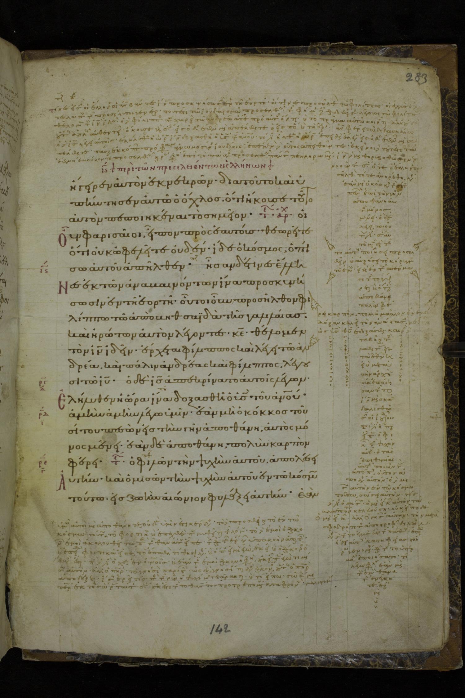 Tenth century minuscule of the Gospels with commentary on parchment; 153 leaves, 1 column, 20 lines per page. Images were taken at the National Library of Greece in Athens.
