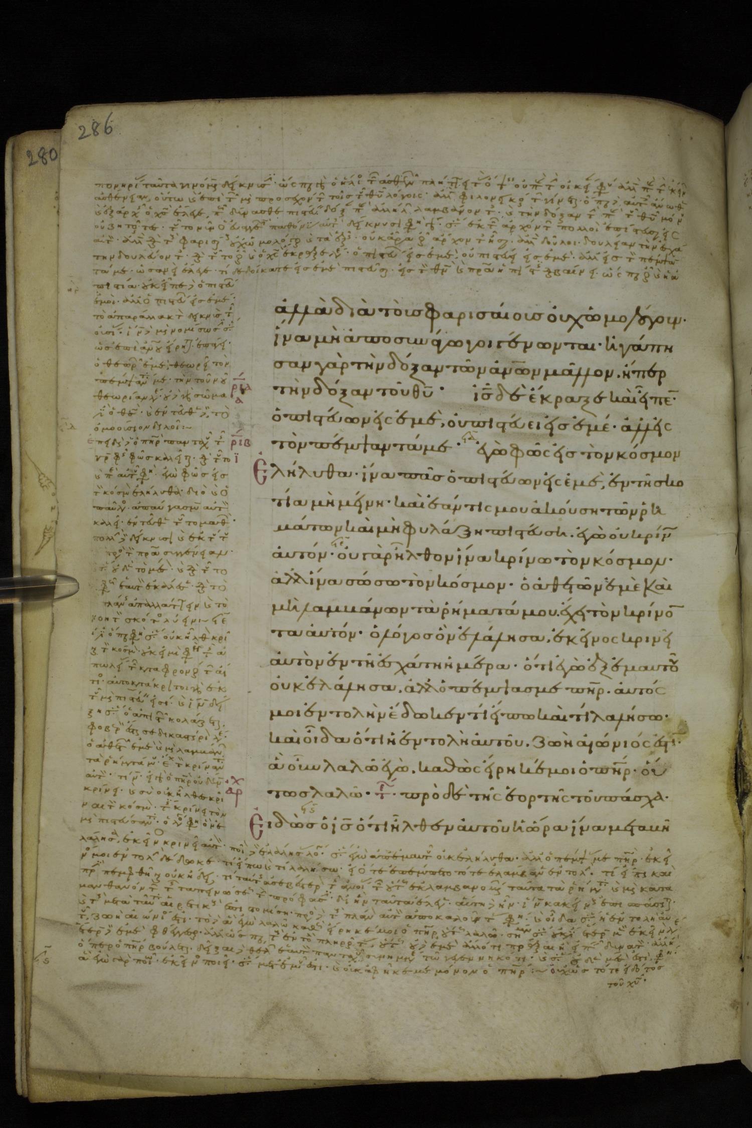 Tenth century minuscule of the Gospels with commentary on parchment; 153 leaves, 1 column, 20 lines per page. Images were taken at the National Library of Greece in Athens.