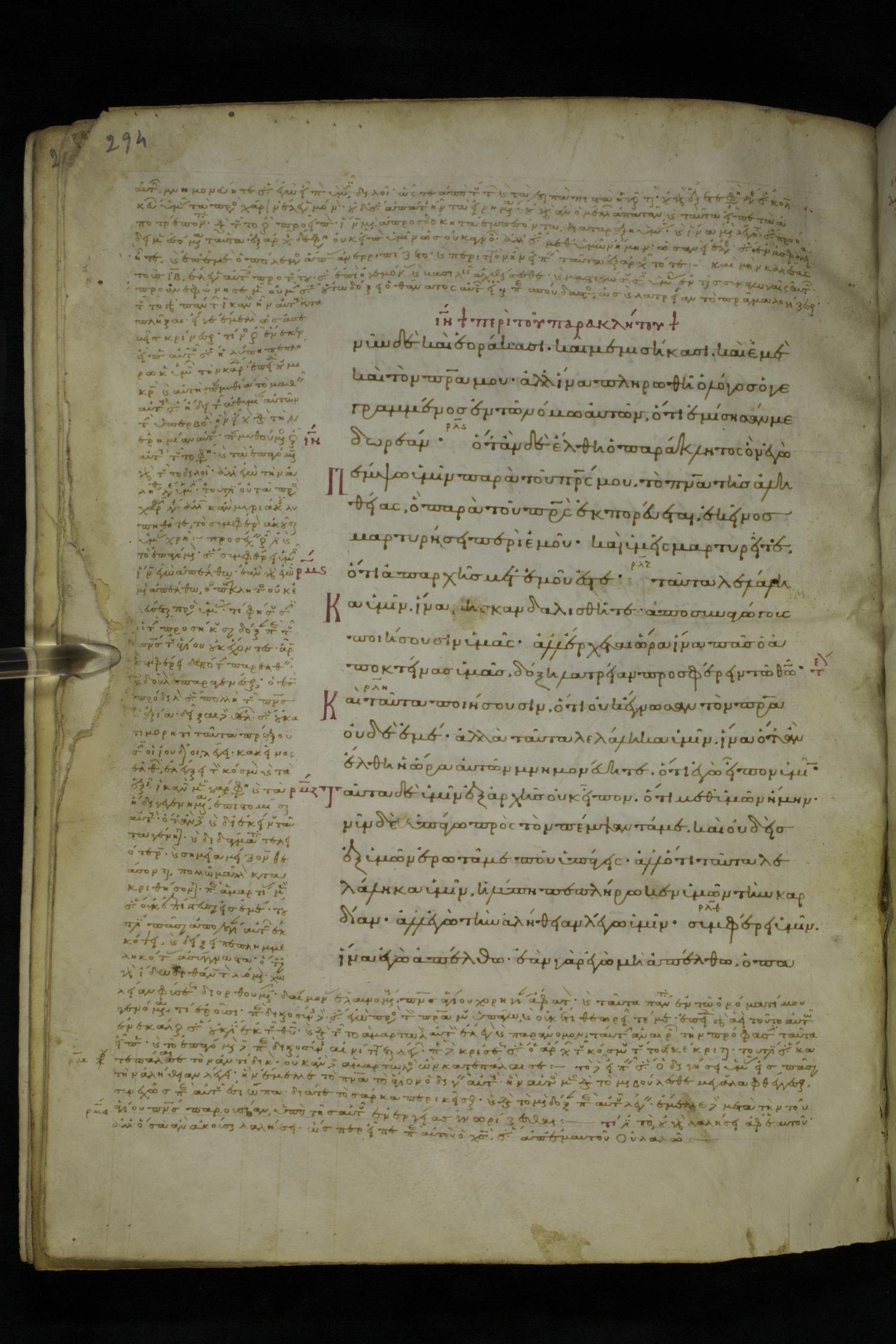 Tenth century minuscule of the Gospels with commentary on parchment; 153 leaves, 1 column, 20 lines per page. Images were taken at the National Library of Greece in Athens.