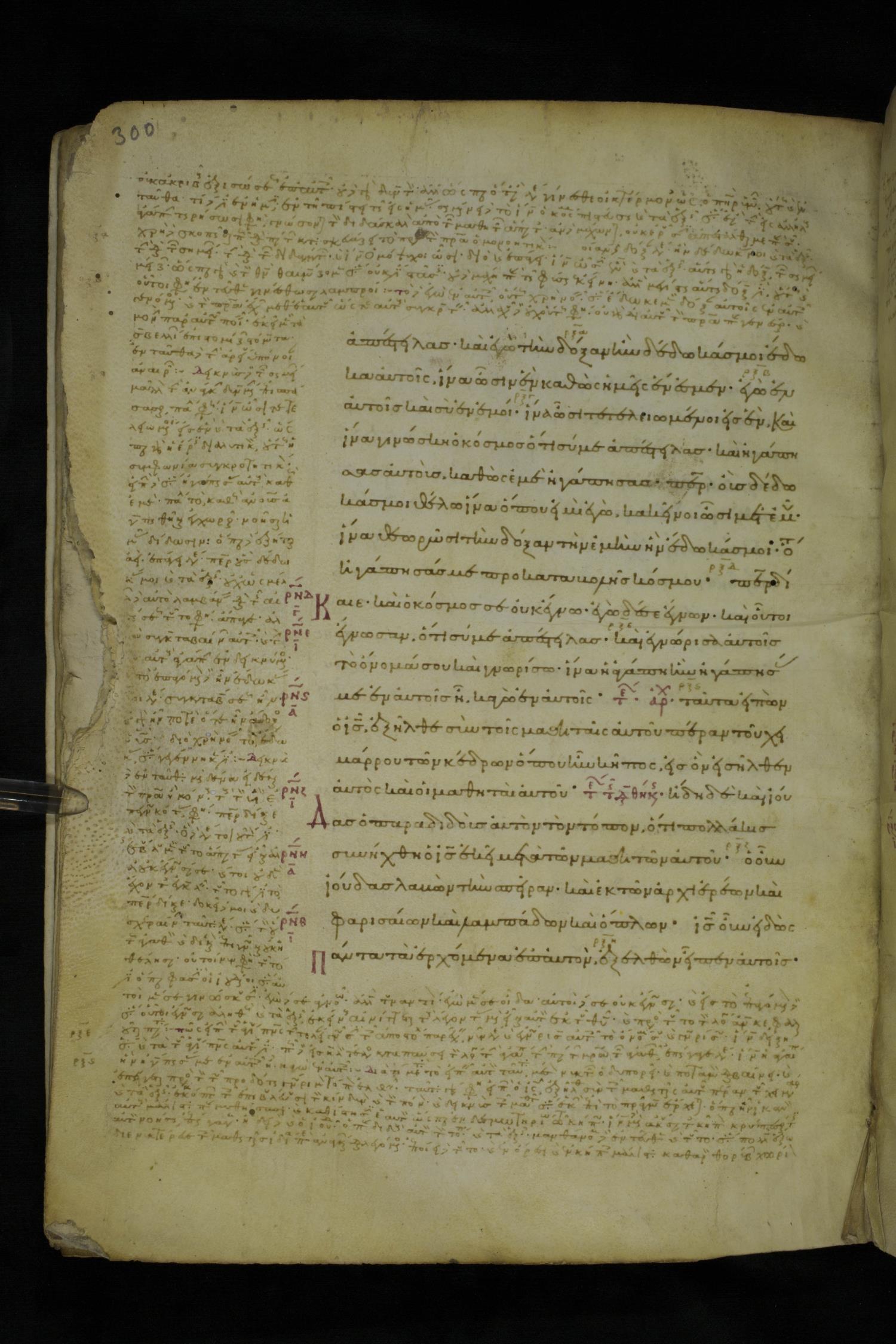 Tenth century minuscule of the Gospels with commentary on parchment; 153 leaves, 1 column, 20 lines per page. Images were taken at the National Library of Greece in Athens.