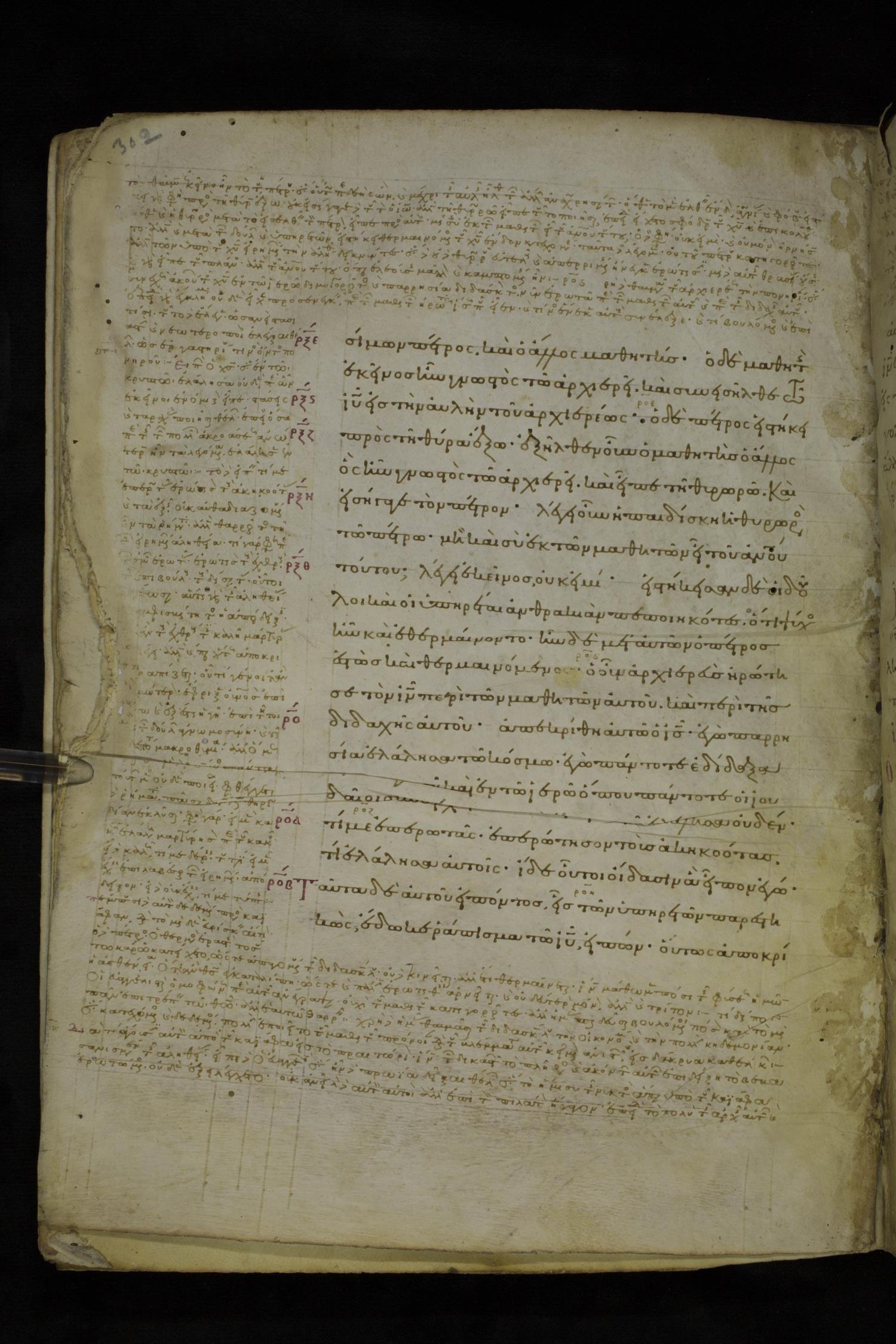 Tenth century minuscule of the Gospels with commentary on parchment; 153 leaves, 1 column, 20 lines per page. Images were taken at the National Library of Greece in Athens.