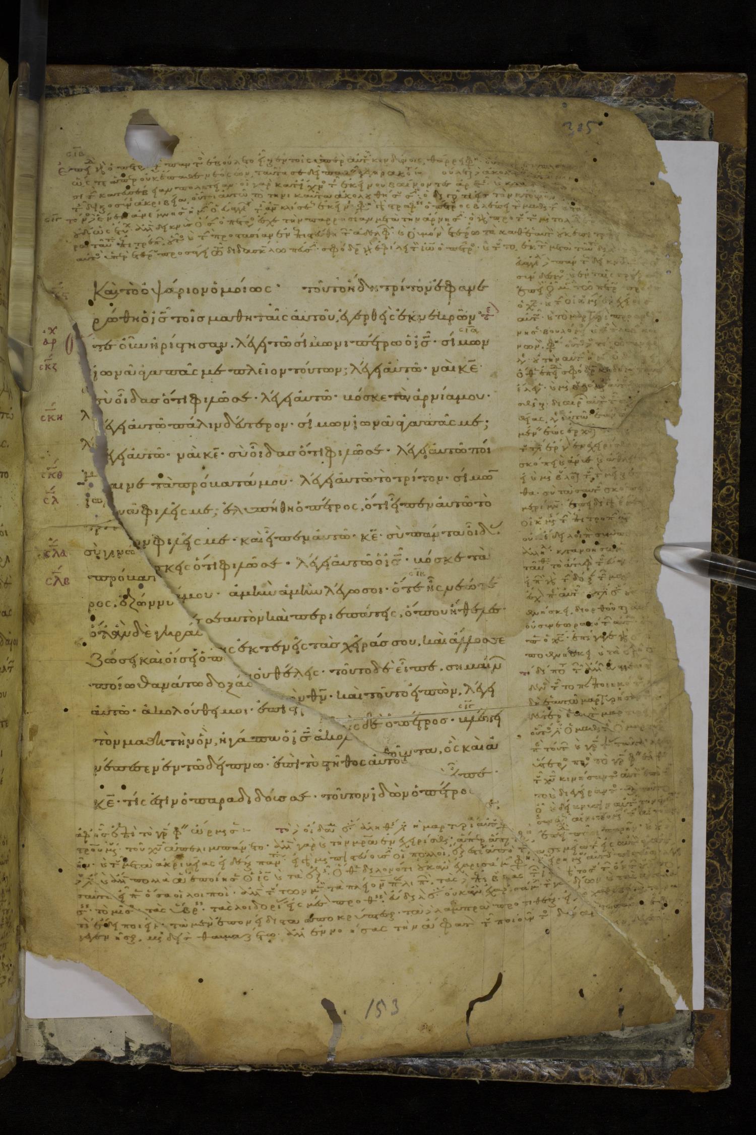 Tenth century minuscule of the Gospels with commentary on parchment; 153 leaves, 1 column, 20 lines per page. Images were taken at the National Library of Greece in Athens.