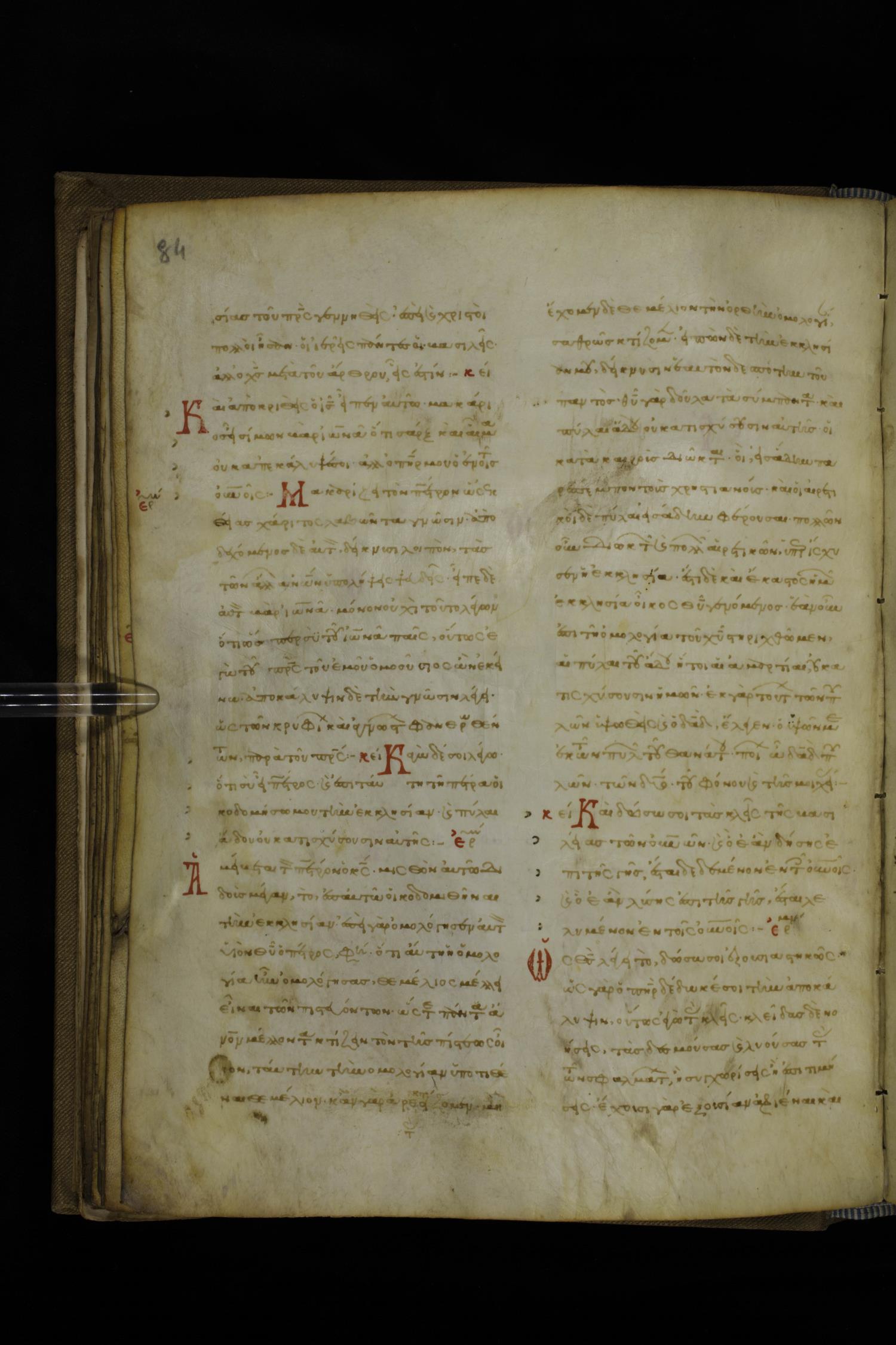 Fourteenth century minuscule of the Gospels with commentary on parchment; 390 leaves, 1-2 columns, 28-32 lines per columns. Images were taken at the National Library of Greece in Athens.