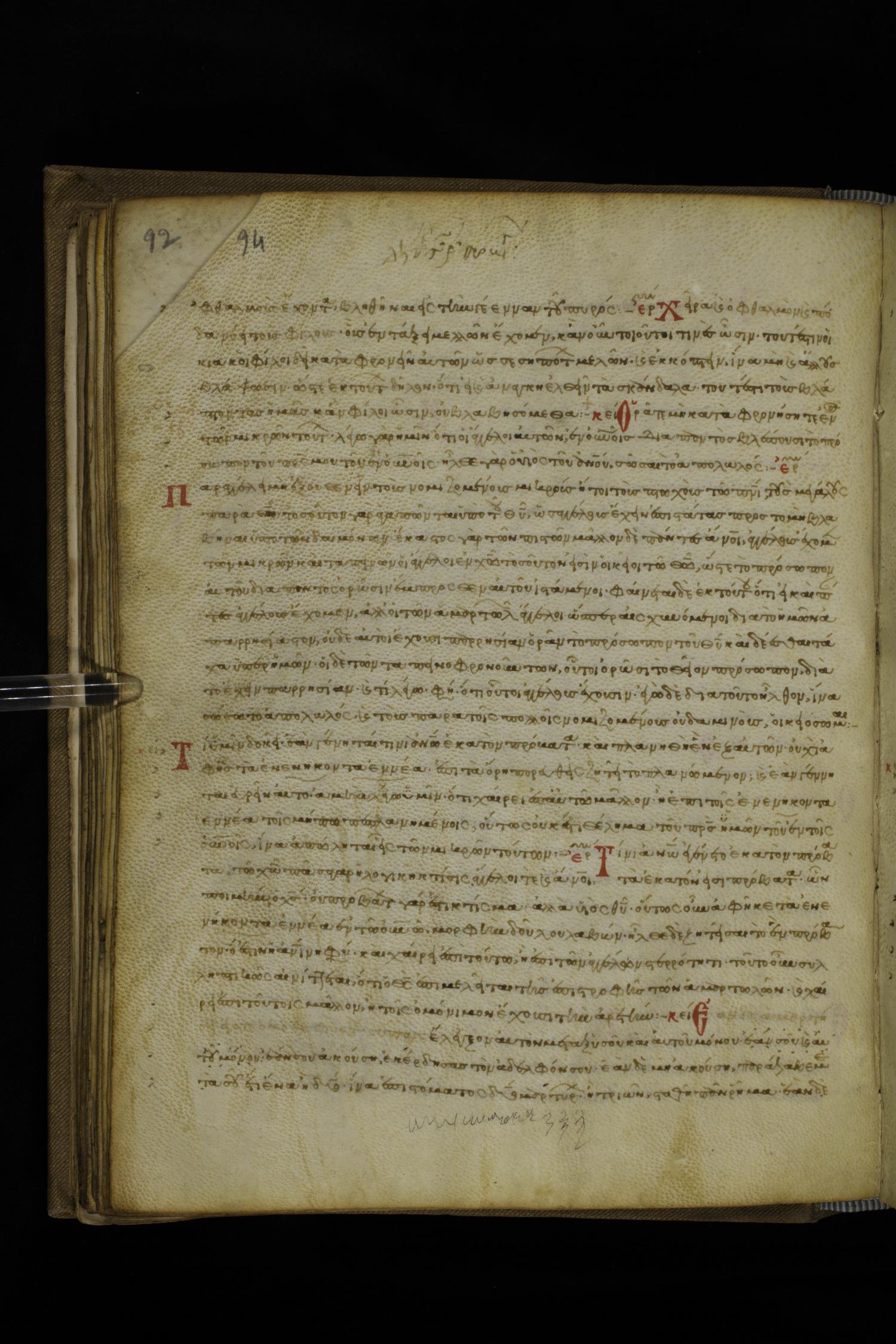 Fourteenth century minuscule of the Gospels with commentary on parchment; 390 leaves, 1-2 columns, 28-32 lines per columns. Images were taken at the National Library of Greece in Athens.
