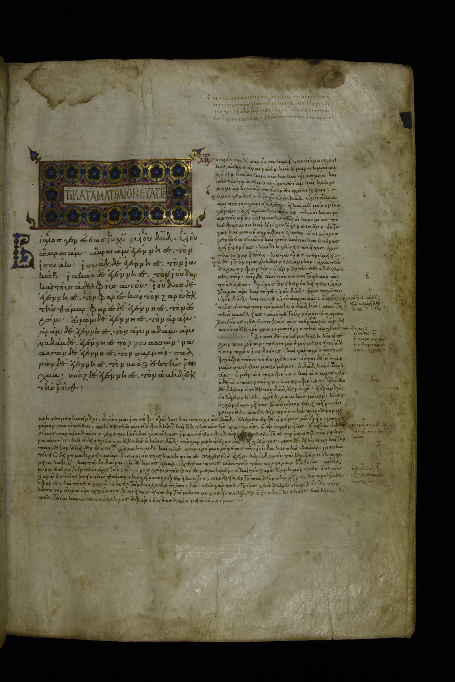 Tenth century minuscule of the Gospels with commentary; 285 leaves, 1 column, 4-34 lines per column. Images were taken at the National Library of Greece in Athens.