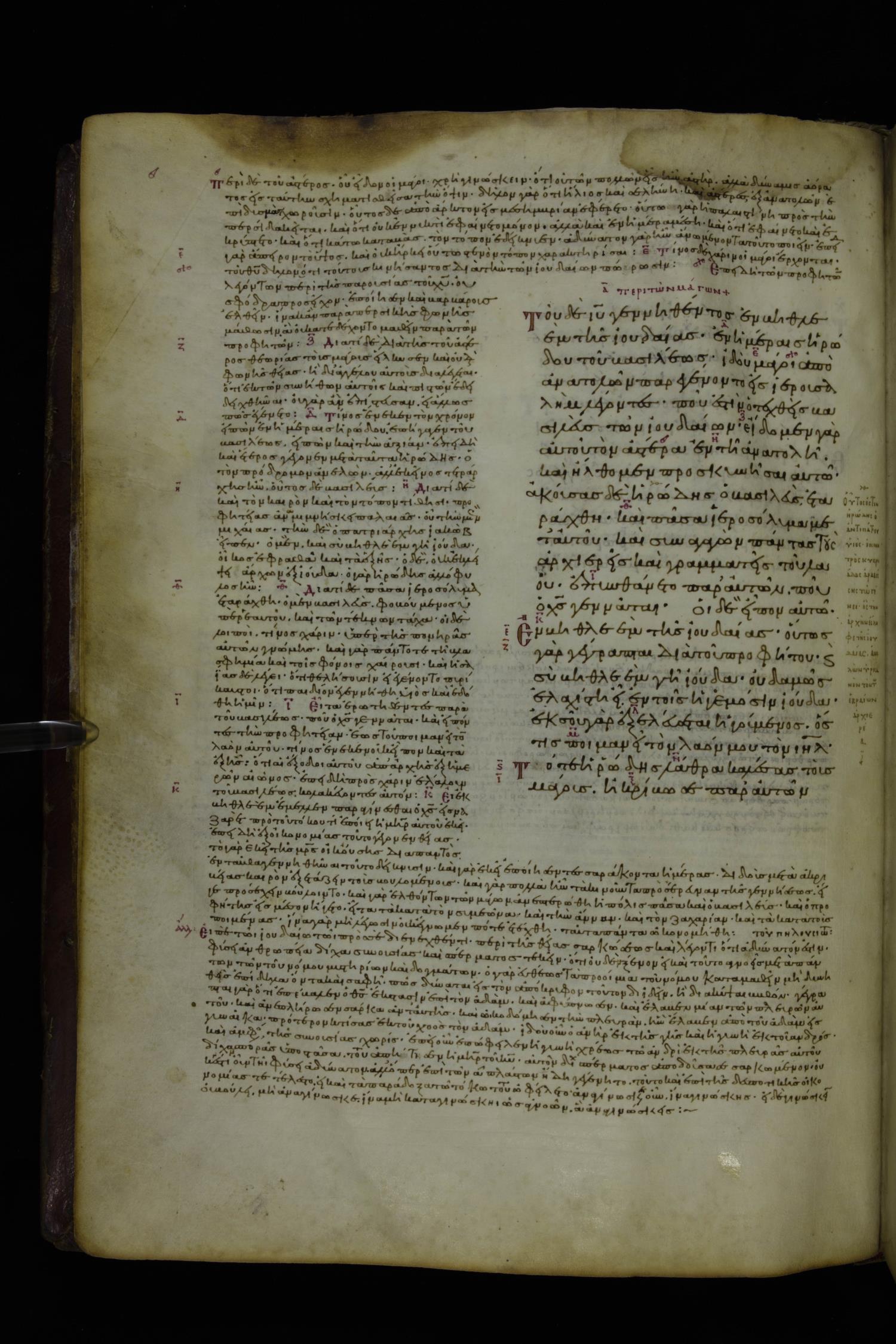 Tenth century minuscule of the Gospels with commentary; 285 leaves, 1 column, 4-34 lines per column. Images were taken at the National Library of Greece in Athens.