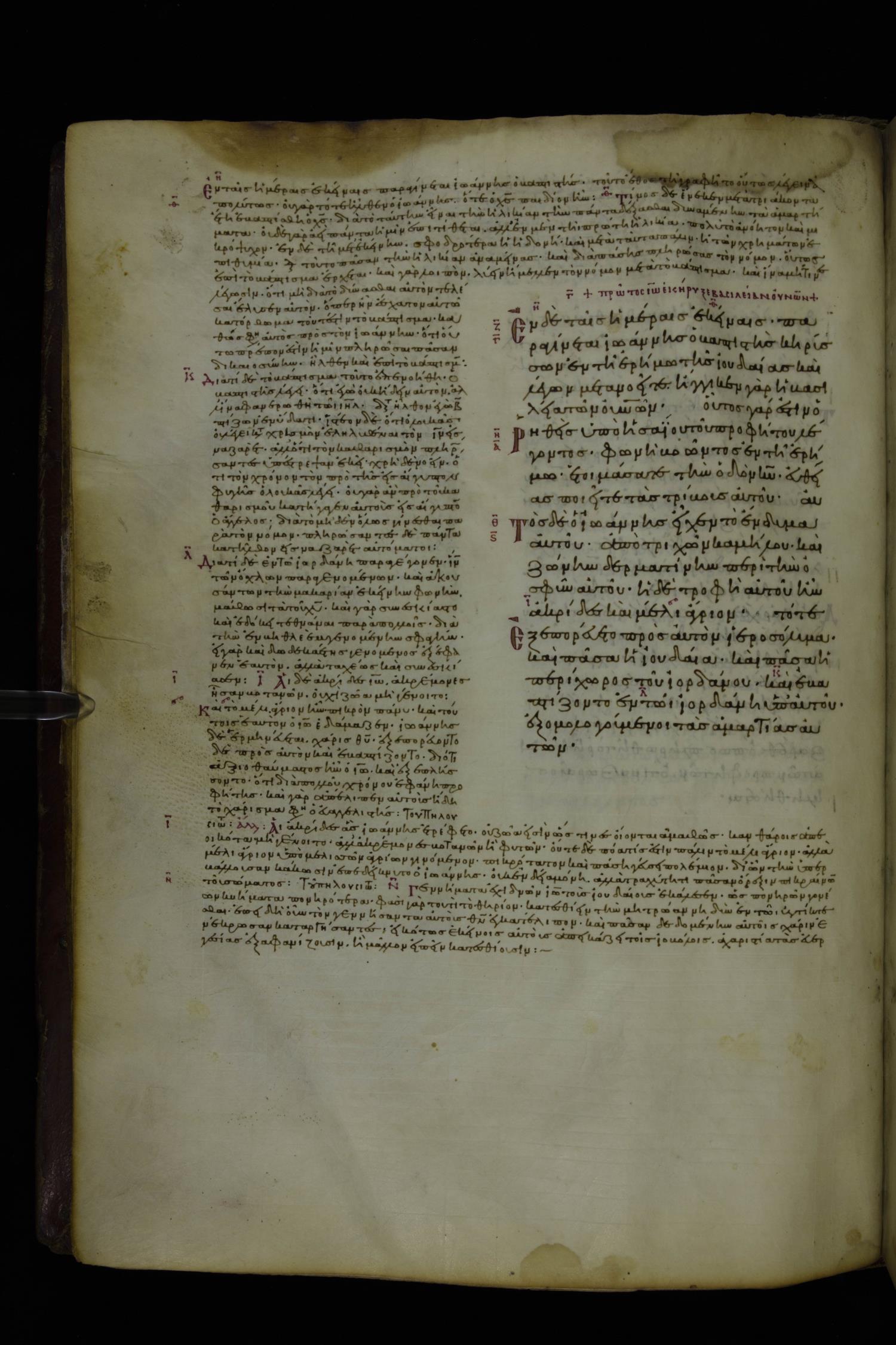 Tenth century minuscule of the Gospels with commentary; 285 leaves, 1 column, 4-34 lines per column. Images were taken at the National Library of Greece in Athens.